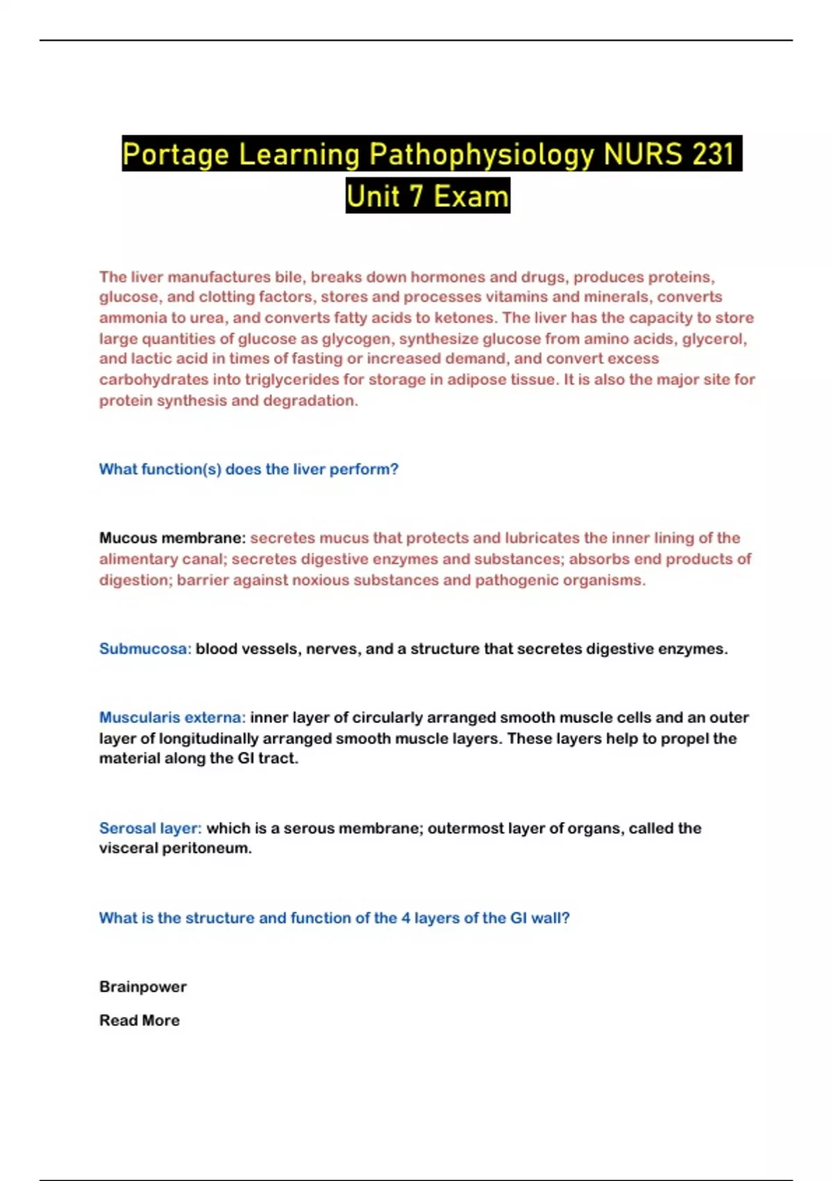 Portage Learning Pathophysiology NURS 231 Unit 7 Exam...