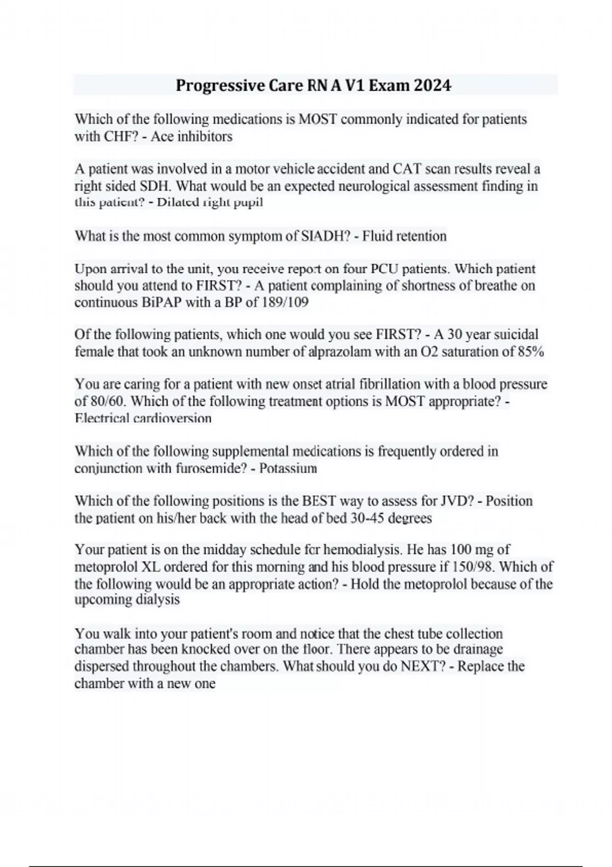 Which of the following medications is MOST commonly indicated for patients with CHF? - Ace inhibitors A patient was involved in a motor vehicle accident and CAT scan results reveal a right sided SDH. What would be an expected neurological assessment finding in this patient? - Dilated right pupil What is the most common symptom of SIADH? - Fluid retention Upon arrival to the unit, you receive report on four PCU patients. Which patient should you attend to FIRST? - A patient complaining of shortness of breathe on continuous BiPAP with a BP of 189/109 Of the following patients, which one would you see FIRST? - A 30 year suicidal female that took an unknown number of alprazolam with an O2 saturation of 85% You are caring for a patient with new onset atrial fibrillation with a blood pressure of 80/60. Which of the following treatment options is MOST appropriate? - Electrical cardioversion Which of the following supplemental medications is frequently ordered in conjunction with furosemide? - Potassium Which of the following positions is the BEST way to assess for JVD? - Position the patient on his/her back with the head of bed 30-45 degrees Your patient is on the midday schedule for hemodialysis. He has 100 mg of metoprolol XL ordered for this morning and his blood pressure if 150/98. Which of the following would be an appropriate action? - Hold the metoprolol because of the upcoming dialysis You walk into your patient's room and notice that the chest tube collection chamber has been knocked over on the floor. There appears to be drainage dispersed throughout the chambers. What should you do NEXT? - Replace the chamber with a new one Your patient is complaining of nausea, vomiting, and diarrhea. His blood pressure is 89/55, heart rate is 122 bpm, and the temperature is 100.8 F. What condition is this patient most likely experiencing? - Hypovolemic shock You are caring for a patient with a chest tube that has become dislodged. Which of the following would you do FIRST? - Cover the insertion site immediately with Vaseline gauze A 78 year old male is admitted from the ED for syncope with ground level fall. You note his heart rate is 50 and the patient is confused. His daughter states she thinks he has dementia but he has not been diagnosed yet. Blood pressure is stable. What order do you anticipate? - Stat head CT A patient with an upper GI bleed has a hgb of 6.1 g/dL. Which of the following orders should you do FIRST? - Prepare to administer 2 units PRBCs Which of the following should be checked before administering digoxin? - Apical pulse A patient with a history of acute seizure activity of unknown etiology is admitted to the PCU from the ED. Which of the following orders would you expect to receive from the admitting provider? - Levetiracetam (Keppra) 500 mg IV every 12 hours and seizure precautions You are caring for a patient post left pneumonectomy with a chest tube in place for drainage. Which of the following is a priority in caring for this patient? - Encourage the patient to cough and deep breathe You are caring for a patient with an order for "furosemide 80 mg BID". Which of the following actions is the MOST appropriate? - Call the provider to clarify the order You are caring for a patient with a Do Not Resuscitate (DNR) order. The patient goes into cardiac arrest and the patient's daughter states "Do whatever you can to save my dad." Which of the following is the BEST response? - Follow the patient's wishes and honor the DNR You are educating your patient about reducing sodium intake. You know that the patient understands when they make the statement: - "I will avoid canned food because it's salty" The trough for vancomycin is measured: - Immediately before the next scheduled dose You are delegating wound care to a LPN. The LPN states that she has never performed this type of wound care before. Which of the following components of delegation have you neglected? - Competency You are caring for a patient in third degree heart block. Which of the following treatment options will MOST likely be implemented? - Pacemaker You are assigned a patient who recently traveled outside of the United States. He has a fever of 101.9 F and excessive diarrhea. You suspect he may have been exposed to Ebola. What type of PPE would you expect to use? - High level PPE Which of the following patients would you see FIRST? - A 57 year old male complaining of worsening chest tightness You enter a patient's room and notice the telemetry box on the bed and the IV on the floor connected to running IV fluids. You last saw the patient 1 hour ago. Who should be notified immediately? - Charge nurse A patient is admitted for a NSTEMI and ST depression is noted in leads II, III, and AVF. Two hours after admission you notice the patient now has ST elevation in each of those leads. What should you do NEXT? - Administer O2 and morphine 2mg IV??? An 18 year old female is admitted from PACU after a cholecystectomy. She has a 22 gauge peripheral IV in her left hand and is due to void. She had morphine 8 mg and Zofran 4 mg in recovery, and is complaining of nausea. She has Phenergan 50 mg IV every 6 hours/PRN. What should you do first? - Start a new IV line in the antecubital region or obtain an order for Phenergan IM A patient is on strict I&Os with an indwelling urinary catheter. 4 hours into your shift you notice that there is a total of 50 mL of urine in the bag. You notify the provider because you recognize that adequate urine output should be: - 30 mL/hr