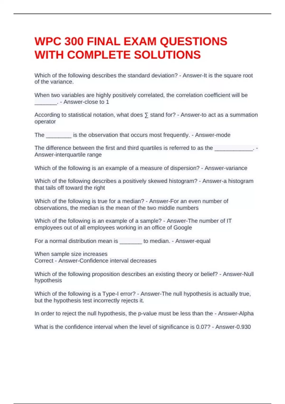 Which of the following describes the standard deviation? - Answer-It is the square root of the variance. When two variables are highly positively correlated, the correlation coefficient will be _______. - Answer-close to 1 According to statistical notation, what does ∑ stand for? - Answer-to act as a summation operator The ________ is the observation that occurs most frequently. - Answer-mode The difference between the first and third quartiles is referred to as the ____________. - Answer-interquartile range Which of the following is an example of a measure of dispersion? - Answer-variance Which of the following describes a positively skewed histogram? - Answer-a histogram that tails off toward the right Which of the following is true for a median? - Answer-For an even number of observations, the median is the mean of the two middle numbers Which of the following is an example of a sample? - Answer-The number of IT employees out of all employees working in an office of Google For a normal distribution mean is _______ to median. - Answer-equal When sample size increases Correct - Answer-Confidence interval decreases Which of the following proposition describes an existing theory or belief? - Answer-Null hypothesis Which of the following is a Type-I error? - Answer-The null hypothesis is actually true, but the hypothesis test incorrectly rejects it. In order to reject the null hypothesis, the p-value must be less than the - Answer-Alpha What is the confidence interval when the level of significance is 0.07? - Answer-0.930