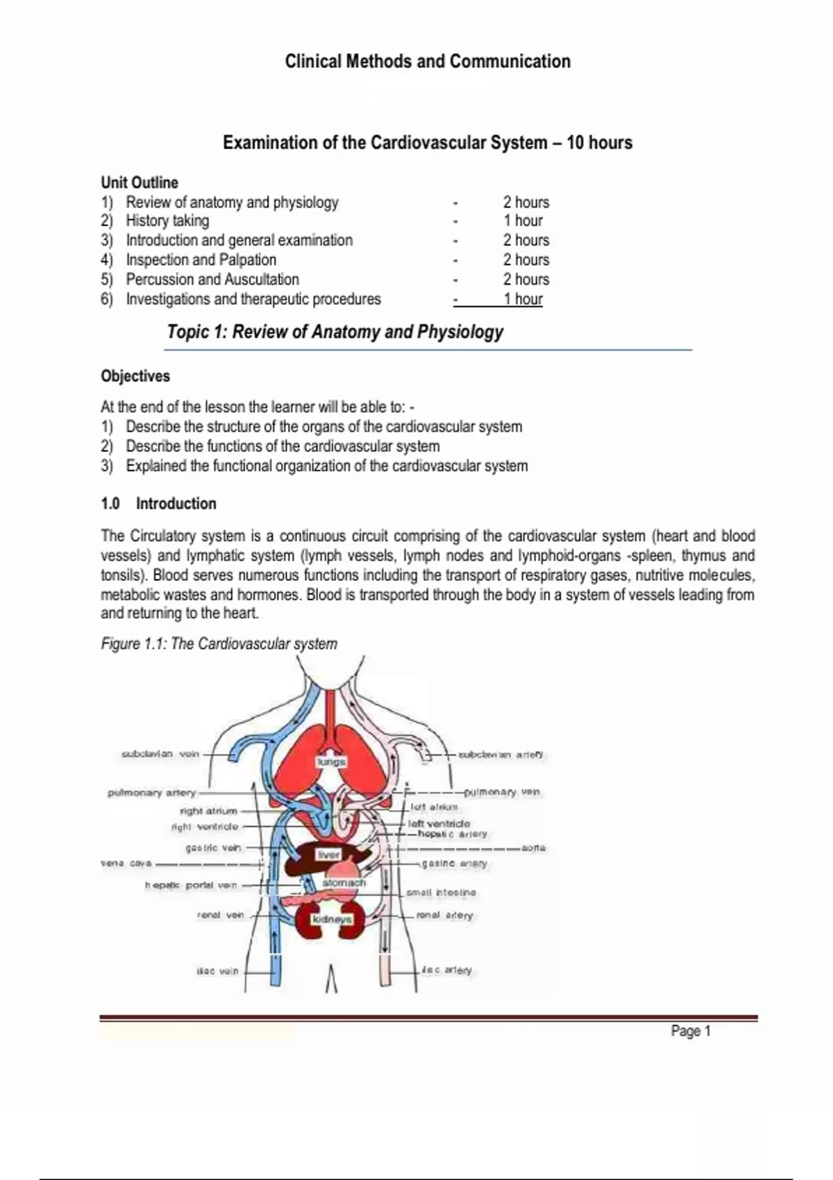 Topic 1: Review of Anatomy and Physiology Objectives At the end of the lesson the learner will be able to: - 1) Describe the structure of the organs of the cardiovascular system 2) Describe the functions of the cardiovascular system 3) Explained the functional organization of the cardiovascular system 1.0 Introduction The Circulatory system is a continuous circuit comprising of the cardiovascular system (heart and blood vessels) and lymphatic system (lymph vessels, lymph nodes and lymphoid-organs -spleen, thymus and tonsils). Blood serves numerous functions including the transport of respiratory gases, nutritive molecules, metabolic wastes and hormones. Blood is transported through the body in a system of vessels leading from and returning to the heart. Figure 1.1: The Cardiovascular system s u b davian vein r ight vootride gastric vein veoa cava ---------+ h-�c PQ1'1al -n --f-f-1--::: ,..,al vein �iac vein 'rt-subclav,ao artery �e-----pulmonary vein left a1rium A�i--f--t>epaUc artery ,tf----------aorta gastnc artery & mal lnteau,.. reoal artery 11,ac artery Page 1 2.0 Functions of the Circulatory System 1) Transportation  Respiratory - red blood cells (erythrocytes) transport oxygen to tissue cells and carbon dioxide is transported by blood to the lungs foe elimination  Nutritive - blood carries absorbed products of digestion through the liver to body cells  Excretory - metabolic wastes, excessive water and ions are filtered through the capillaries of the kidney and excreted in urine 2) Regulation  Blood carries hormones and other regulatory molecules from the site of origin to target tissues 3) Protection  Protects against injury and foreign microbes or toxins  Clotting mechanism prevents blood loss when vessels are damaged  Leucocytes (white blood cells) provide immunity THE CARDIOVASCULAR SYSTEM Is made up of the heart and blood vessels The Heart The heart is a four chambered; double pump that keeps blood flowing through the circulation and a normal heart weighs 250 – 350 g in an adult. Its pumping action creates the pressure needed to push blood in the vessels to the lungs and body cells. The function of the heart is to pump sufficient oxygenated blood containing nutrients, metabolites and hormones to meet the moment to moment metabolic needs and preserve a constant milieu. The flow of blood through the circulatory system is made possible by the pumping action of the ventricles and atria Figure 2: The Heart lntenor V e na Cava Right Ventricle Pulmonary Mary Left Atrium M1tral valve Left Venlride