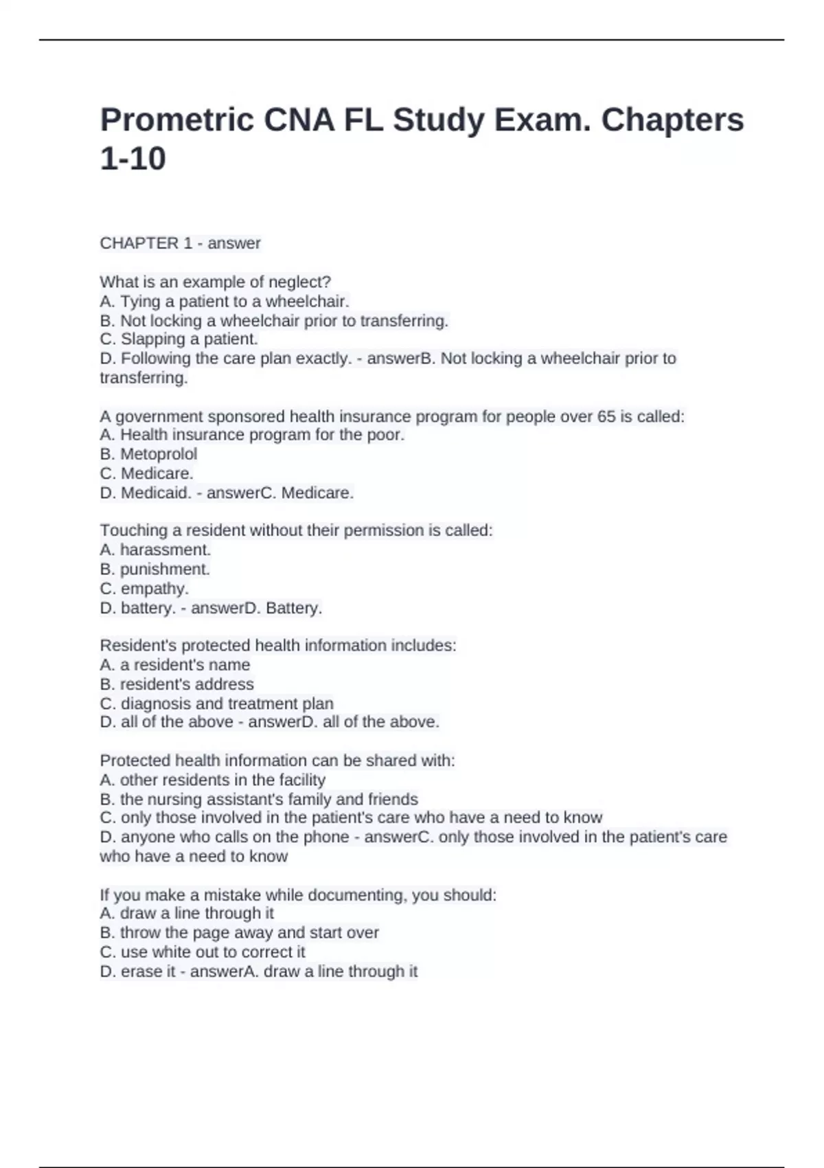 Prometric CNA FL Study Exam. Chapters