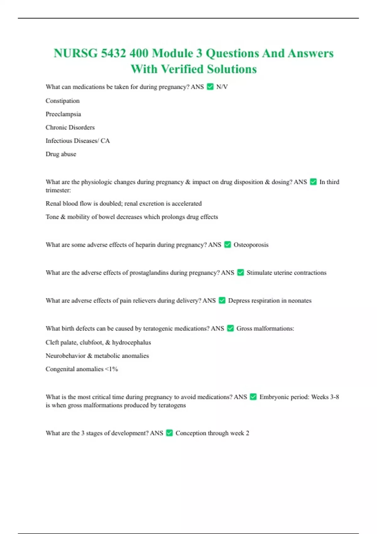NURSG 5432 400 Module 3 Questions And Answers With Verified Solutions What can medications be taken for during pregnancy? ANS N/V Constipation Preeclampsia Chronic Disorders Infectious Diseases/ CA Drug abuse What are the physiologic changes during pregnancy & impact on drug disposition & dosing? ANS In third trimester: Renal blood flow is doubled; renal excretion is accelerated Tone & mobility of bowel decreases which prolongs drug effects What are some adverse effects of heparin during pregnancy? ANS Osteoporosis What are the adverse effects of prostaglandins during pregnancy? ANS Stimulate uterine contractions