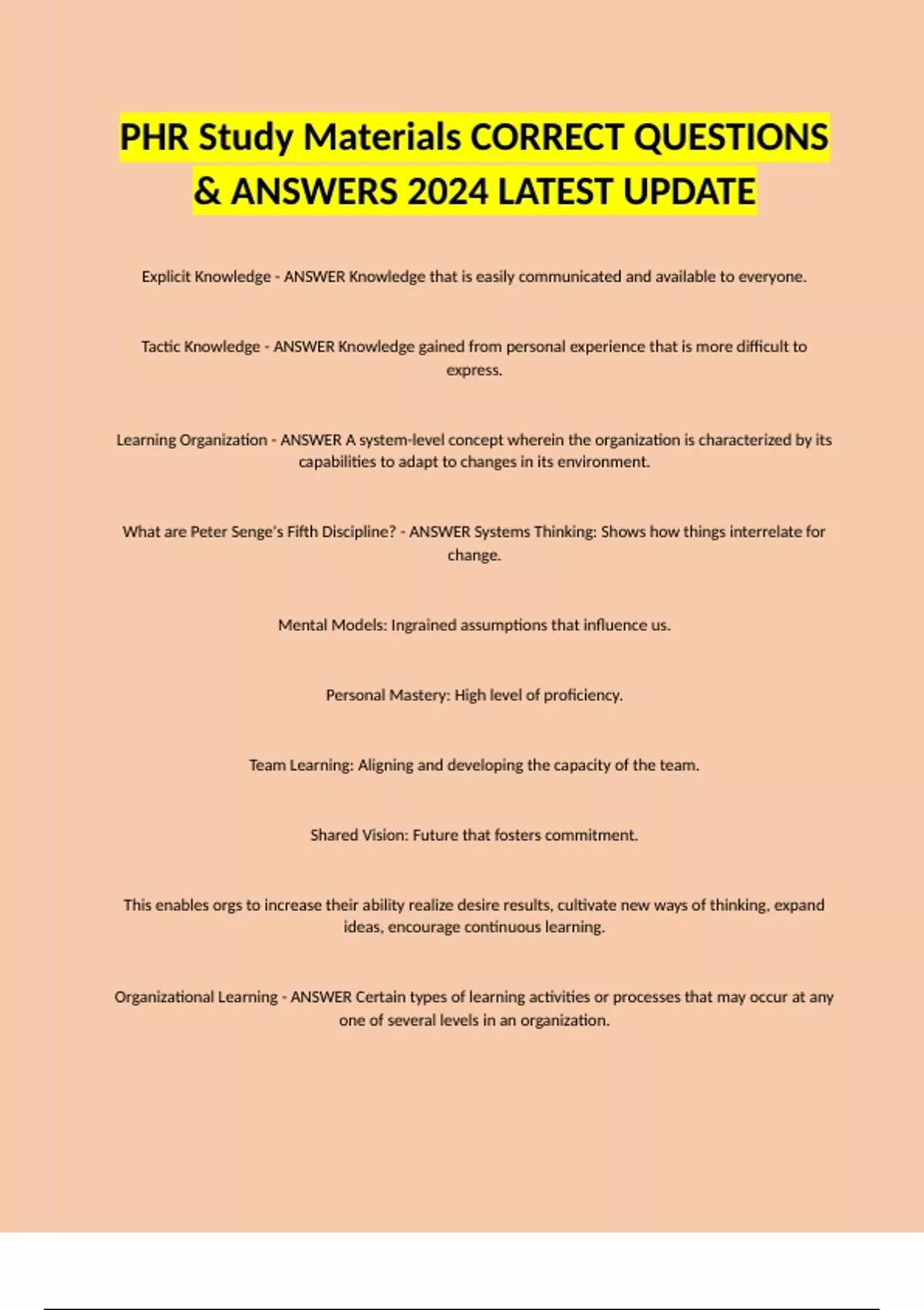 PHR Study Materials CORRECT QUESTIONS & ANSWERS 2024 LATEST UPDATE