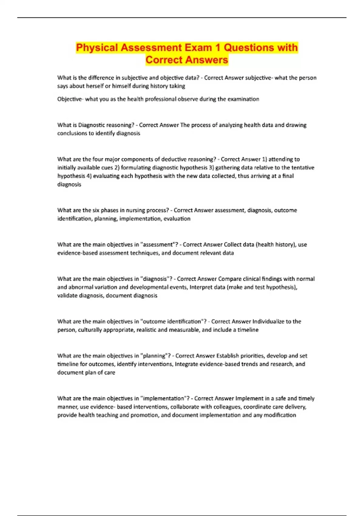 Physical Assessment Exam 1 Questions with Correct Answers What is the difference in subjective and objective data? - Correct Answer subjective- what the person says about herself or himself during history taking Objective- what you as the health professional observe during the examination What is Diagnostic reasoning? - Correct Answer The process of analyzing health data and drawing conclusions to identify diagnosis What are the four major components of deductive reasoning? - Correct Answer 1) attending to initially available cues 2) formulating diagnostic hypothesis 3) gathering data relative to the tentative hypothesis 4) evaluating each hypothesis with the new data collected, thus arriving at a final diagnosis What are the six phases in nursing process? - Correct Answer assessment, diagnosis, outcome identification, planning, implementation, evaluation What are the main objectives in "assessment"? - Correct Answer Collect data (health history), use evidence-based assessment techniques, and document relevant data What are the main objectives in "diagnosis"? - Correct Answer Compare clinical findings with normal and abnormal variation and developmental events, Interpret data (make and test hypothesis), validate diagnosis, document diagnosis What are the main objectives in "outcome identification"? - Correct Answer Individualize to the person, culturally appropriate, realistic and measurable, and include a timeline What are the main objectives in "planning"? - Correct Answer Establish priorities, develop and set timeline for outcomes, identify interventions, Integrate evidence-based trends and research, and document plan of care What are the main objectives in "implementation"? - Correct Answer Implement in a safe and timely manner, use evidence- based interventions, collaborate with colleagues, coordinate care delivery, provide health teaching and promotion, and document implementation and any modification