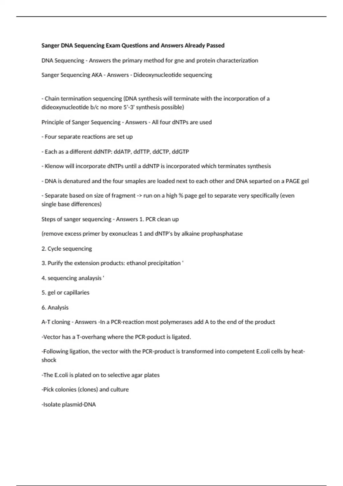 Steps of sanger sequencing - Answers 1. PCR clean up