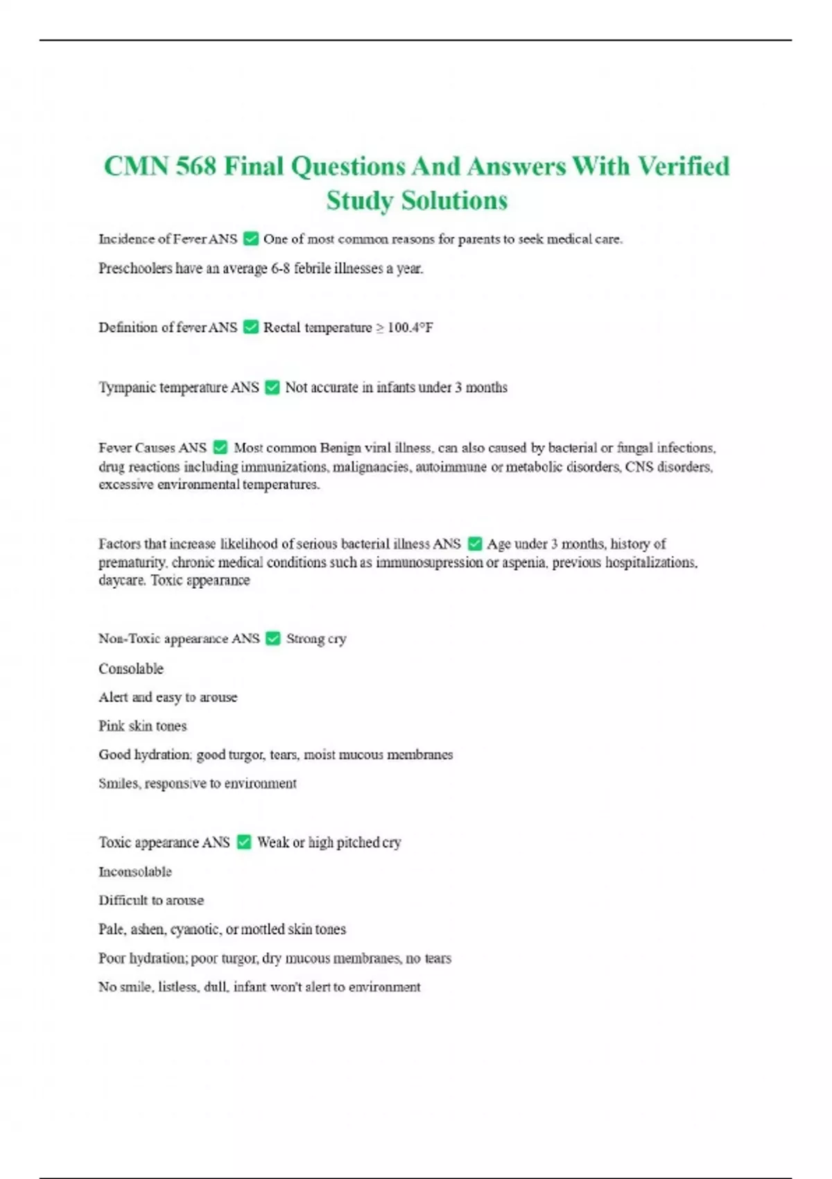 CMN 568 Final Questions And Answers With Verified Study Solutions Incidence of Fever ANS One of most common reasons for parents to seek medical care. Preschoolers have an average 6-8 febrile illnesses a year. Definition of fever ANS Rectal temperature ≥ 100.4°F Tympanic temperature ANS Not accurate in infants under 3 months Fever Causes ANS Most common Benign viral illness, can also caused by bacterial or fungal infections, drug reactions including immunizations, malignancies, autoimmune or metabolic disorders, CNS disorders, excessive environmental temperatures. Factors that increase likelihood of serious bacterial illness ANS Age under 3 months, history of prematurity, chronic medical conditions such as immunosupression or aspenia, previous hospitalizations, daycare. Toxic appearance