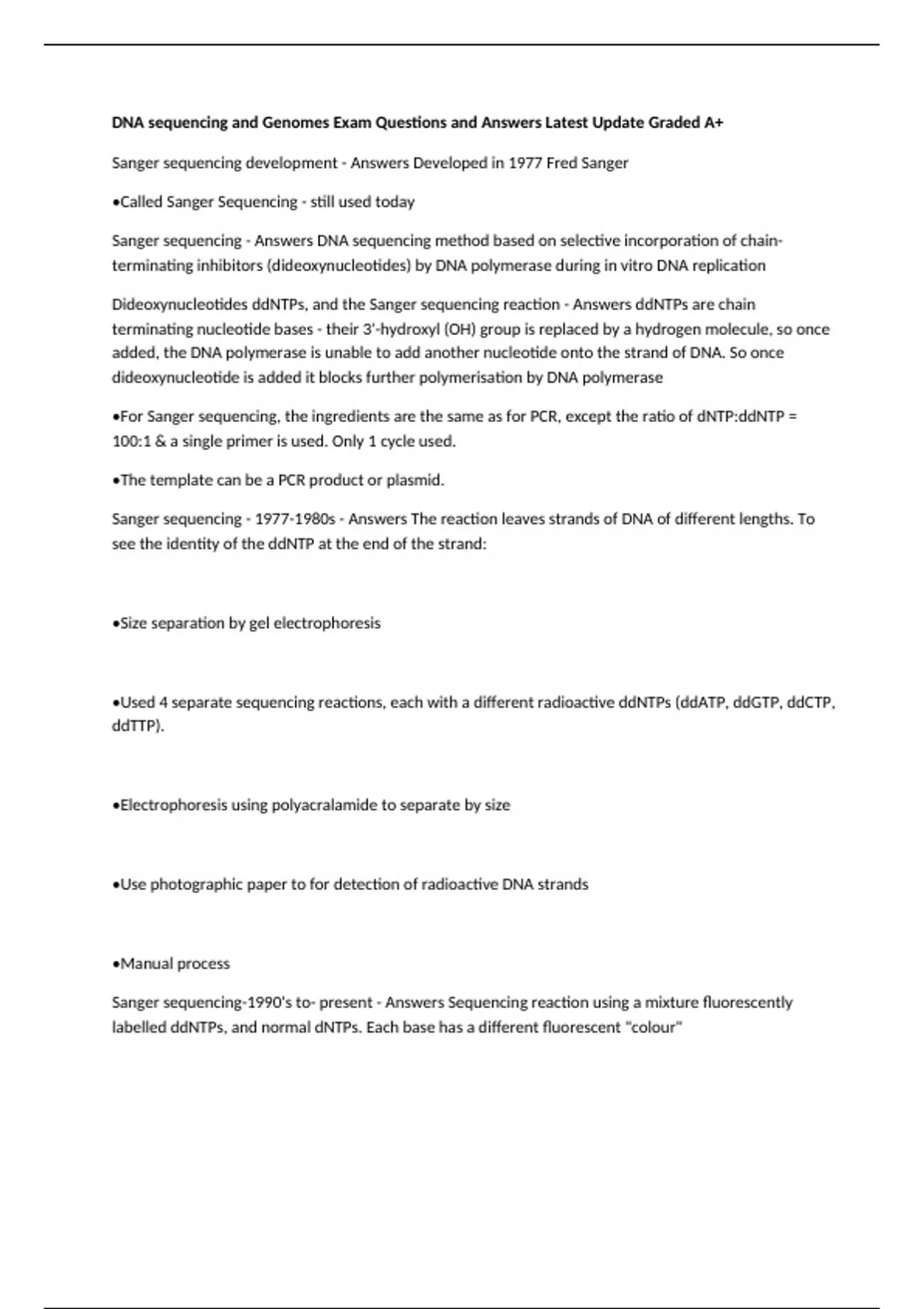 DNA sequencing and Genomes Exam Questions and Answers Latest Update Graded A+ Sanger sequencing development - Answers Developed in 1977 Fred Sanger •Called Sanger Sequencing - still used today Sanger sequencing - Answers DNA sequencing method based on selective incorporation of chain-terminating inhibitors (dideoxynucleotides) by DNA polymerase during in vitro DNA replication Dideoxynucleotides ddNTPs, and the Sanger sequencing reaction - Answers ddNTPs are chain terminating nucleotide bases - their 3'-hydroxyl (OH) group is replaced by a hydrogen molecule, so once added, the DNA polymerase is unable to add another nucleotide onto the strand of DNA. So once dideoxynucleotide is added it blocks further polymerisation by DNA polymerase •For Sanger sequencing, the ingredients are the same as for PCR, except the ratio of dNTP:ddNTP = 100:1 & a single primer is used. Only 1 cycle used. •The template can be a PCR product or plasmid. Sanger sequencing - s - Answers The reaction leaves strands of DNA of different lengths. To see the identity of the ddNTP at the end of the strand: •Size separation by gel electrophoresis •Used 4 separate sequencing reactions, each with a different radioactive ddNTPs (ddATP, ddGTP, ddCTP, ddTTP). •Electrophoresis using polyacralamide to separate by size •Use photographic paper to for detection of radioactive DNA strands •Manual process Sanger sequencing-1990's to- present - Answers Sequencing reaction using a mixture fluorescently labelled ddNTPs, and normal dNTPs. Each base has a different fluorescent "colour" Chain-termination PCR produces mixture of DNA strands of different lengths Size separation by gel electrophoresis, each DNA strand ends in a 'ddNTP terminator' Detection of fluorescent products using a laser (automated) - same method for microsatellite genotyping Genome - Answers The complete set of genetic information present in a cell or organism Genome size - Answers (the total number of the DNA base pairs in one copy of a haploid genome) varies widely across species Nuclear genome of the human genome - Answers DNA encoded within the 23 chromosome pairs found in nuclei Mitochondrial genome - Answers a small circular DNA molecule found within individual mitochondria encoding 37 genes (2 rRNAs, 22 tRNAs and 13 polypeptides) Human genome project - timeline - Answers •1977 - Sanger sequencing •1989 - UK Medical Research Council (MRC) & USA jointly funded the Human Genome Project •1990 - project begins: International team of researchers start - worlds largest collaborative biological project •2003 - Completed Human genome project - goals - Answers •Identify and map all genes in the human DNA from a physical and functional standpoint •Determine the sequences •Store information in databases •Discover efficient technologies for data analysis •Sequence other genomes of medical importance: mouse, yeast, Drosophila Human genome project - sequencing centre - Answers The Wellcome Trust Sanger Institute The sequence content of the human genome - Answers Transposons Transposons - Answers jumping genes Can replicate and insert into other parts of the genome •First discovered by Barbara McClintock, in maize •Two categories: ● Retrotransposons (transpose via mRNA) ● DNA transposons •Most mobile elements in bacteria - Answers DNA transposons Most mobile elements in eukaryotes - Answers retrotransposons (e.g. LINEs), but eukaryotic DNA transposons also occur Retrotransposons - Answers encode reverse transcriptase. •After transcription, the RNA is converted into DNA, then inserted into another part of the genome. •Alu elements comprise 11% of the human genome. •Alu is a SINE. These do not encode a functional reverse transcriptase protein and exploit LINE transposition components to transpose Simple sequence repeats - Answers Microsatellites and Minisatellites