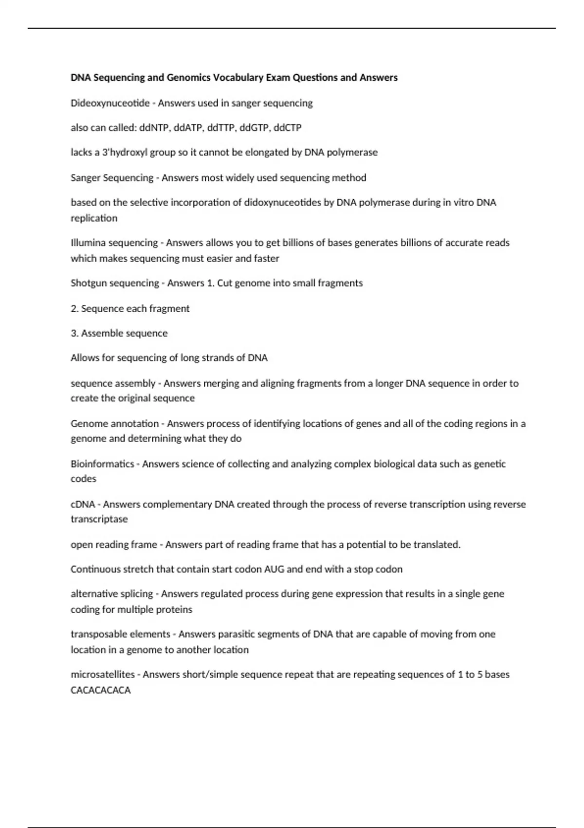 DNA Sequencing and Genomics Vocabulary Exam Questions and Answers Dideoxynuceotide - Answers used in sanger sequencing also can called: ddNTP, ddATP, ddTTP, ddGTP, ddCTP lacks a 3'hydroxyl group so it cannot be elongated by DNA polymerase Sanger Sequencing - Answers most widely used sequencing method based on the selective incorporation of didoxynuceotides by DNA polymerase during in vitro DNA replication Illumina sequencing - Answers allows you to get billions of bases generates billions of accurate reads which makes sequencing must easier and faster Shotgun sequencing - Answers 1. Cut genome into small fragments 2. Sequence each fragment 3. Assemble sequence Allows for sequencing of long strands of DNA sequence assembly - Answers merging and aligning fragments from a longer DNA sequence in order to create the original sequence Genome annotation - Answers process of identifying locations of genes and all of the coding regions in a genome and determining what they do Bioinformatics - Answers science of collecting and analyzing complex biological data such as genetic codes cDNA - Answers complementary DNA created through the process of reverse transcription using reverse transcriptase open reading frame - Answers part of reading frame that has a potential to be translated. Continuous stretch that contain start codon AUG and end with a stop codon alternative splicing - Answers regulated process during gene expression that results in a single gene coding for multiple proteins transposable elements - Answers parasitic segments of DNA that are capable of moving from one location in a genome to another location microsatellites - Answers short/simple sequence repeat that are repeating sequences of 1 to 5 bases CACACACACA