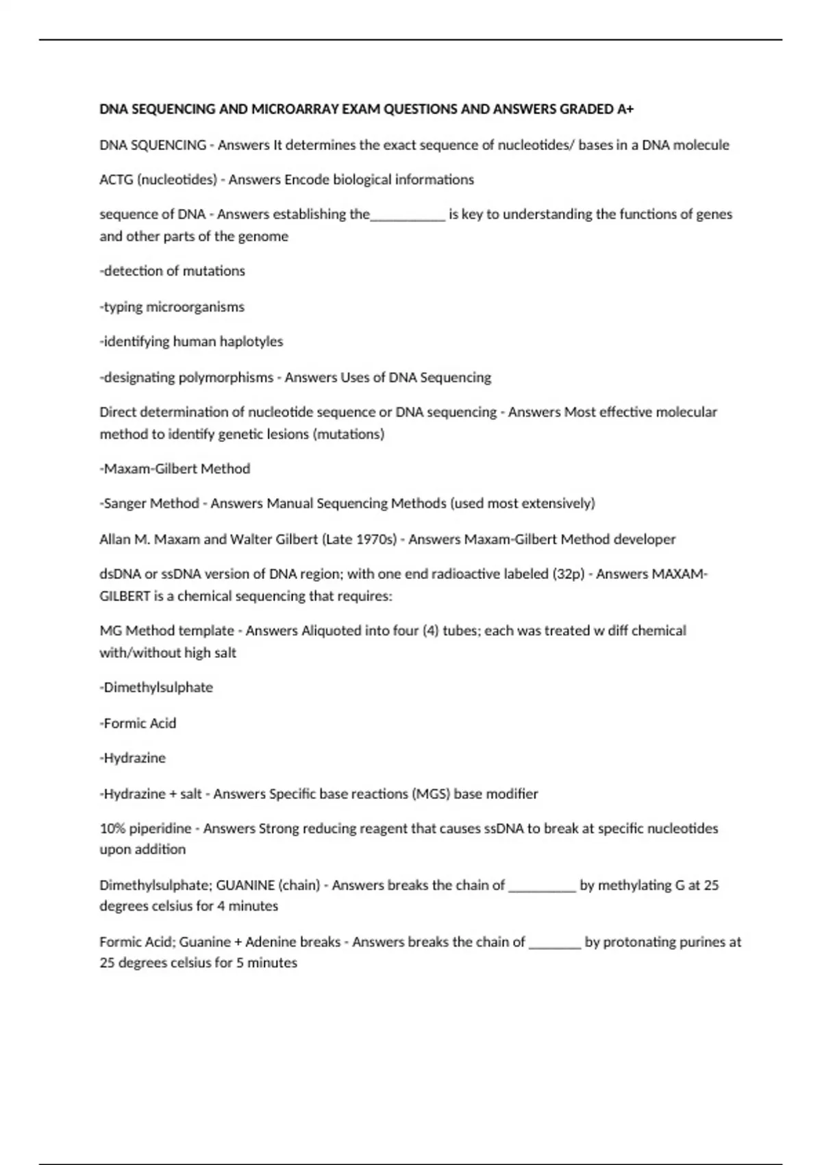 DNA SEQUENCING AND MICROARRAY EXAM QUESTIONS AND ANSWERS GRADED A+ DNA SQUENCING - Answers It determines the exact sequence of nucleotides/ bases in a DNA molecule ACTG (nucleotides) - Answers Encode biological informations sequence of DNA - Answers establishing the__________ is key to understanding the functions of genes and other parts of the genome -detection of mutations -typing microorganisms -identifying human haplotyles -designating polymorphisms - Answers Uses of DNA Sequencing Direct determination of nucleotide sequence or DNA sequencing - Answers Most effective molecular method to identify genetic lesions (mutations) -Maxam-Gilbert Method -Sanger Method - Answers Manual Sequencing Methods (used most extensively) Allan M. Maxam and Walter Gilbert (Late 1970s) - Answers Maxam-Gilbert Method developer dsDNA or ssDNA version of DNA region; with one end radioactive labeled (32p) - Answers MAXAM-GILBERT is a chemical sequencing that requires: MG Method template - Answers Aliquoted into four (4) tubes; each was treated w diff chemical with/without high salt -Dimethylsulphate -Formic Acid -Hydrazine -Hydrazine + salt - Answers Specific base reactions (MGS) base modifier 10% piperidine - Answers Strong reducing reagent that causes ssDNA to break at specific nucleotides upon addition Dimethylsulphate; GUANINE (chain) - Answers breaks the chain of _________ by methylating G at 25 degrees celsius for 4 minutes Formic Acid; Guanine + Adenine breaks - Answers breaks the chain of _______ by protonating purines at 25 degrees celsius for 5 minutes Hydrazine; Thymine + Cytosine - Answers breaks the chain of _______ by spliting pyrimidine rings at 25 degrees celsius for 8 minutes Hydrazine + salt; Cytosine - Answers breaks the chain of _______ by spliting only Cytosine rings at 25 degrees celsius for 8 minutes formamide gel loading (AFTER MABREAK) - Answers Maxam- Gilbert Method: After reactions, piperidine is evaporated; contents of each tube dried and resuspended in ______________ denaturating Polyacrylamide gel - Answers Maxam- Gilbert Method: fragments are then separated by size on a Denaturating conditions - Answers Prevent the ssDNA fr hydrogen bonding w one another or folding up so that they migrate through the gel strictly acc to their size Migration speed - Answers Maxam- Gilbert Method: it is important bc single-base resolution is req to interpret the sequence properly Gel dryer - Answers After electrophoresis; this is where sheet of filter paper was dried after gel was removed Light sensitive film - Answers where dried gel will be exposed Wet gels - Answers Maxam- Gilbert sequencing: can be Exposed directly Bottom to the top - Answers Maxam- Gilbert sequencing: The gel is read fr Maxam- Gilbert Method - Answers -not practical for high throughput sequencing of long fragments -relatively efficient way to determine short runs of sequence data Hazardous chemicals hydrazine and piperidine - Answers Require more elaborate precautions for use and storage Dideoxy chain termination sequencing method - Answers Maxam- Gilbert Method is replaced by: Sanger method - Answers THE ORIGINAL dideoxy chain termmination sequencing method required a single-stranded template Classical Sanger Method Modified Sanger Method - Answers 2 classification of Sanger Method M13 BACTERIOPHAGE - Answers Templated up to a few thousand bases long could be produced using (a bacterial virus with ssDNA genome) Replication factor - Answers The virus replicated by infecting E. coli, in which the viral ss circular