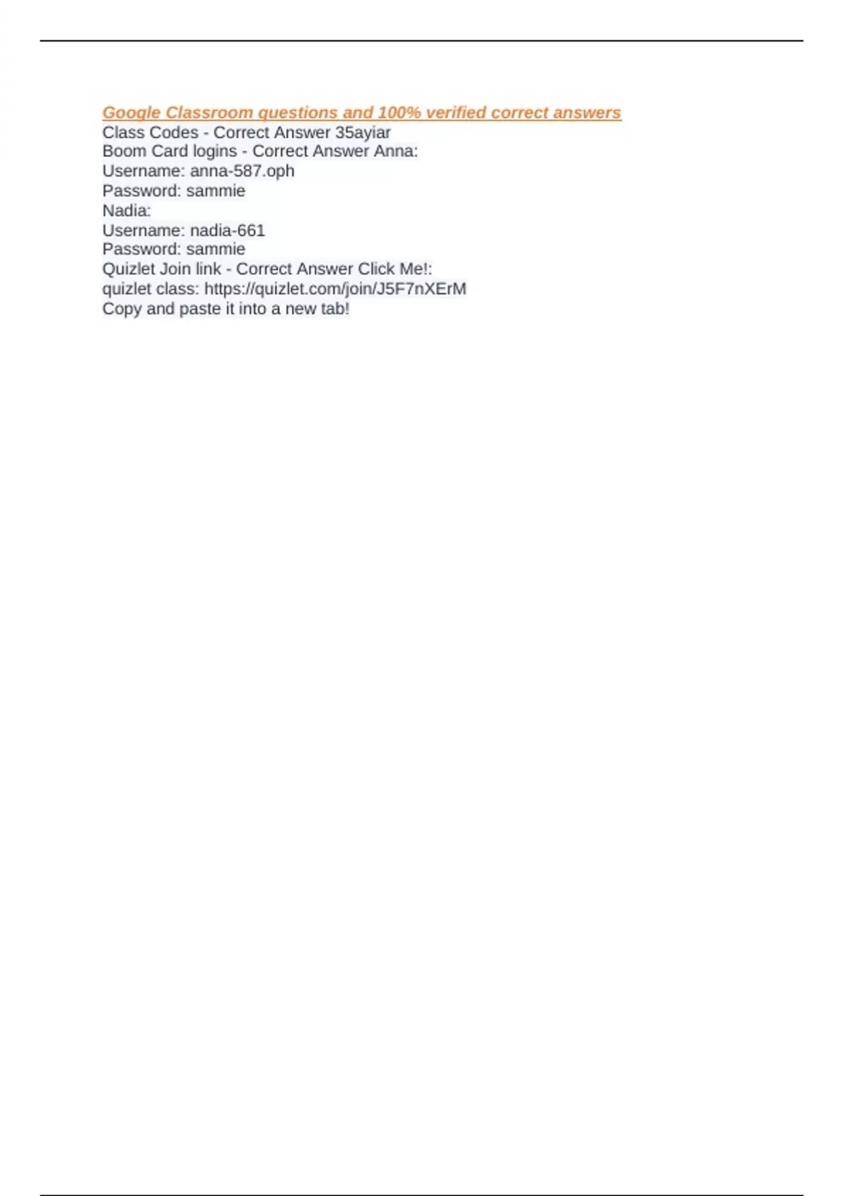 Google Classroom questions and 100% verified correct answers Class Codes - Correct Answer 35ayiar Boom Card logins - Correct Answer Anna: Username: Password: sammie Nadia: Username: nadia-661 Password: sammie Quizlet Join link - Correct Answer Click Me!: quizlet class: Copy and paste it into a new tab!