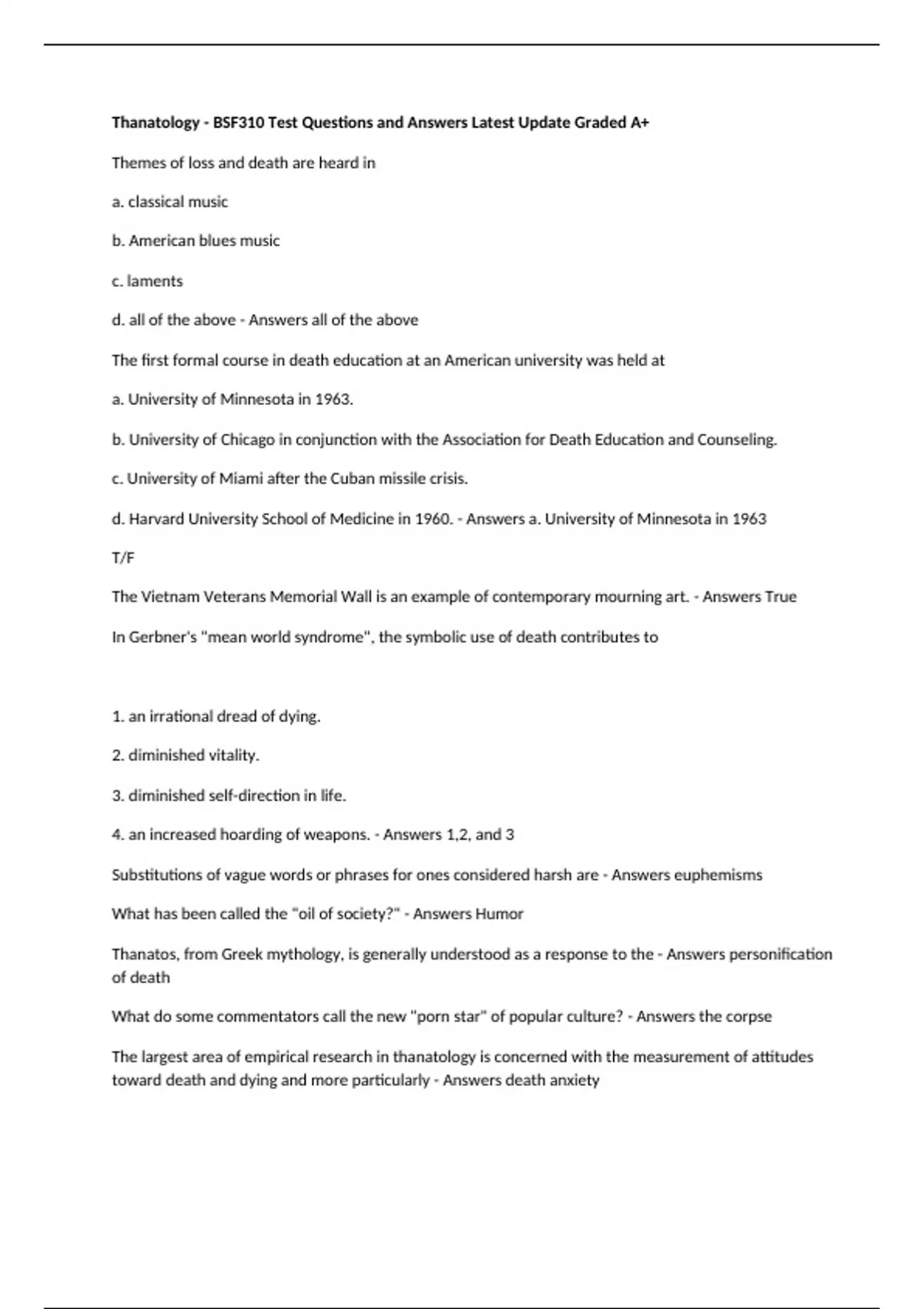 Thanatology - BSF310 Test Questions and Answers Latest Update Graded A+ Themes of loss and death are heard in a. classical music b. American blues music c. laments d. all of the above - Answers all of the above The first formal course in death education at an American university was held at a. University of Minnesota in 1963. b. University of Chicago in conjunction with the Association for Death Education and Counseling. c. University of Miami after the Cuban missile crisis. d. Harvard University School of Medicine in 1960. - Answers a. University of Minnesota in 1963 T/F The Vietnam Veterans Memorial Wall is an example of contemporary mourning art. - Answers True In Gerbner's "mean world syndrome", the symbolic use of death contributes to 1. an irrational dread of dying. 2. diminished vitality. 3. diminished self-direction in life. 4. an increased hoarding of weapons. - Answers 1,2, and 3 Substitutions of vague words or phrases for ones considered harsh are - Answers euphemisms What has been called the "oil of society?" - Answers Humor Thanatos, from Greek mythology, is generally understood as a response to the - Answers personification of death What do some commentators call the new "porn star" of popular culture? - Answers the corpse The largest area of empirical research in thanatology is concerned with the measurement of attitudes toward death and dying and more particularly - Answers death anxiety In reviewing death anxiety research, Robert Kastenbaum says that it - Answers allows individuals to enjoy the illusion that death has been studied. T/F Elegies and eulogies are both often inscribed as a memorial on a tomb. - Answers False T/F People who describe themselves as religious suffer more death anxiety than their non-religious counterparts. - Answers False What are the two leading causes of death in the United States? - Answers Heart disease and cancer Deaths of the famous are likely to be announced on the newspaper's front page as well as via feature-length - Answers obituaries Avoiding words like dead or dying, instead using phrases in which loved ones "pass away," the deceased is "laid to rest" and the corpse is "remains", is an example of - Answers euphemisms Children who have had first-hand encounters with death tend to - Answers have a developmentally more mature understanding of death In Erickson's model, approximately what age marks the beginning of the child's moral sense? - Answers Preschool and kindergarten years A mature concept of death involves 1. universality. 2. irreversibility. 3. empiricism. 4. causality. - Answers 1, 2, and 4 The story of Little Red Riding Hood in Chinese tradition differs from the Western version in which of the following ways? - Answers The tree children in the Chinese version work together as a group to kill the wolf Which of the following best defines socialization? - Answers Learning and internalizing the norms, rules, and values of the society in which a person lives T/F Following the assassination of President Kennedy, older children were more concerned than younger children about the appearance of the president's body. - Answers False In Piaget's model, the first two years of life are characterized as the - Answers sensorimotor What term refers to the uprooting and restructuring of basic attitudes, values, or identities? - Answers resocialization By what age do most children understand that death is a changed state? - Answers preschool years T/F A "teachable" moment is most often best reserved for the classroom. - Answers False T/F The Copernican stage marks the beginning of a child's moral sense. - Answers False T/F An example of the term resocialization is the starting of a new job. - Answers True T/F Veterinary schools can provide information on pet cemeteries, burials and cremation, but may not discuss hospice care for pets. - Answers False In a study of nursery rhymes, approximately what percentage describe ways in which humans or animals die or are mistreated? - Answers 50% When asked, "What makes things die?" a child responds, "You can die if you swallow a dirty bug." According to Piaget's theory, this child is probably in which developmental stage? - Answers Preoperational T/F Anatomy dissections historically have been an activity attended only by surgeons and medical students. - Answers False In Japanese funeral rituals, all of the following rites are held EXCEPT the - Answers belongings of the deceased are buried with the body. The rural cemetery movement began in the United States - Answers in the 1830s. In many traditional societies communication with the dead is facilitated by a - Answers shaman Dia de los Muertos is - Answers an occasion for remembering the dead.