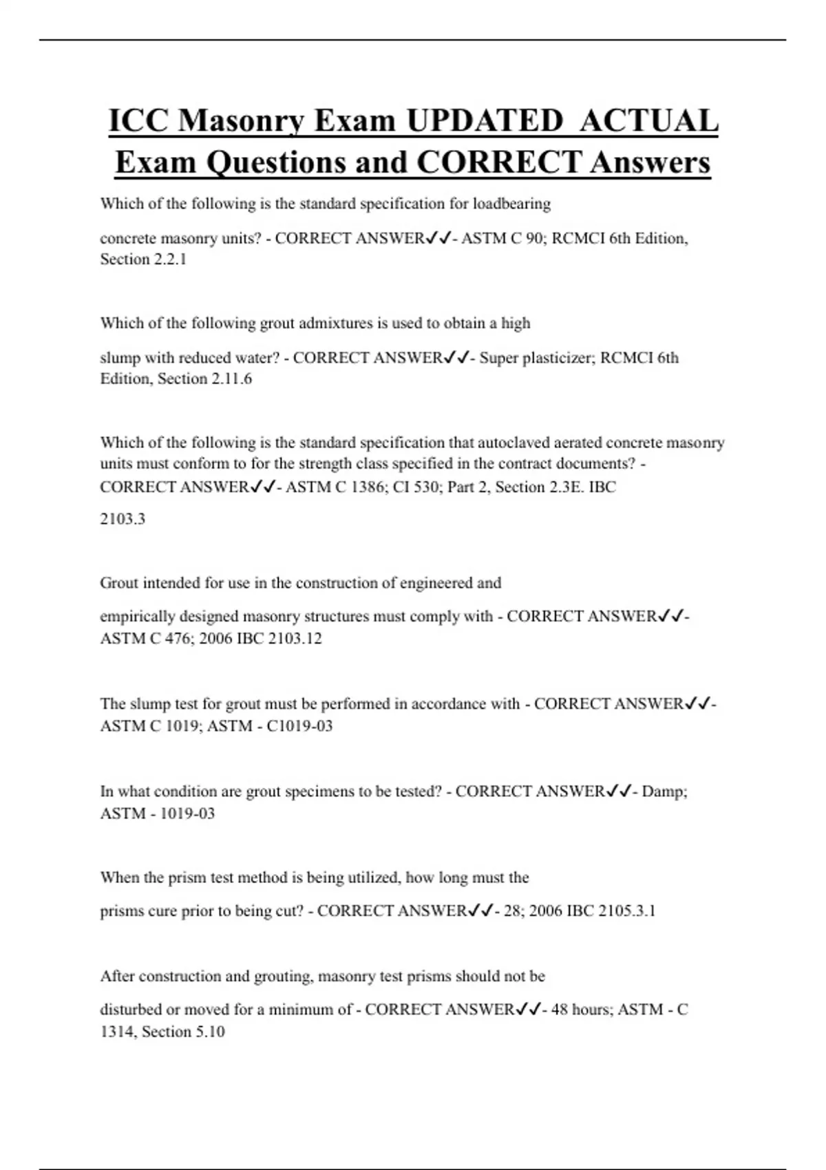 ICC Masonry Exam UPDATED ACTUAL Exam Questions and CORRECT Answers Which of the following is the standard specification for loadbearing concrete masonry units? - CORRECT ANSWER- ASTM C 90; RCMCI 6th Edition, Section 2.2.1 Which of the following grout admixtures is used to obtain a high slump with reduced water? - CORRECT ANSWER- Super plasticizer; RCMCI 6th Edition, Section 2.11.6