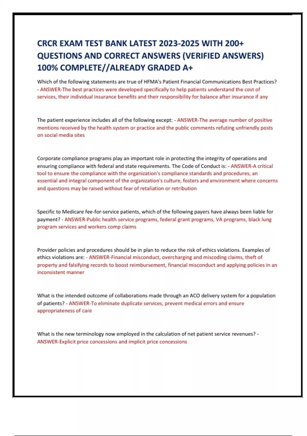 CRCR EXAM TEST BANK LATEST WITH 200+ QUESTIONS AND CORRECT ANSWERS (VERIFIED ANSWERS) 100% COMPLETE//ALREADY GRADED A+ Which of the following statements are true of HFMA's Patient Financial Communications Best Practices? CRCR EXAM TEST BANK LATEST WITH 200+ QUESTIONS AND CORRECT ANSWERS (VERIFIED ANSWERS) 100% COMPLETE//ALREADY GRADED A+ Which of the following statements are true of HFMA's Patient Financial Communications Best Practices? CRCR EXAM TEST BANK LATEST WITH 200+ QUESTIONS AND CORRECT ANSWERS (VERIFIED ANSWERS) 100% COMPLETE//ALREADY GRADED A+ Which of the following statements are true of HFMA's Patient Financial Communications Best Practices?