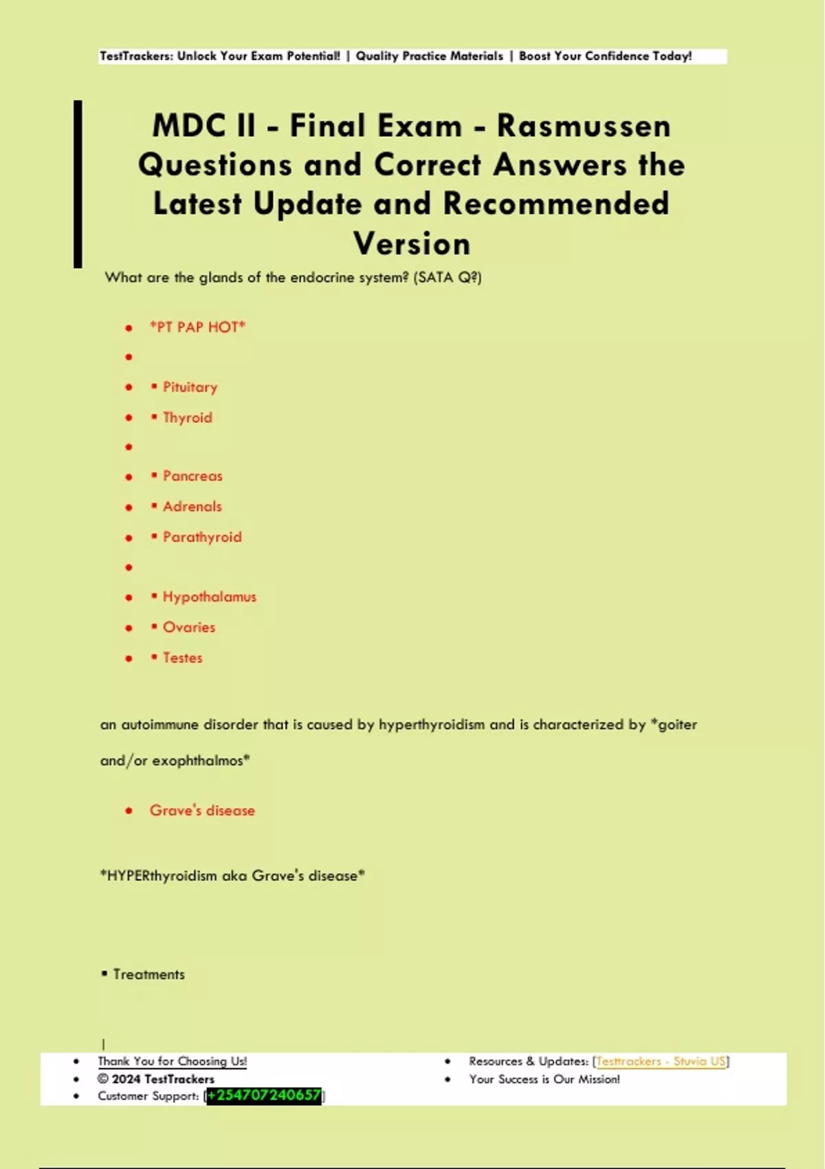 What are the glands of the endocrine system? (SATA Q?) • *PT PAP HOT* • • ▪ Pituitary • ▪ Thyroid • • ▪ Pancreas • ▪ Adrenals • ▪ Parathyroid • • ▪ Hypothalamus • ▪ Ovaries • ▪ Testes an autoimmune disorder that is caused by hyperthyroidism and is characterized by *goiter and/or exophthalmos* • Grave's disease *HYPERthyroidism aka Grave's disease* ▪ Treatments TestTrackers: Unlock Your Exam Potential! | Quality Practice Materials | Boost Your Confidence Today! | • Thank You for Choosing Us! • © 2024 TestTrackers • Customer Support: [] • Resources & Updates: [Testtrackers - Stuvia US] • Your Success is Our Mission! • *Treatments* • ▪ Rx: methimazole, atenolol, and *iodine-131* • ▪ radiation therapy • • *Nursing Interventions* • ▪ provide a calm environment • ▪ keep patients room cool • ▪ assess pain • ▪ prepare patient for surgery • ▪ post-operative care • ▪ maintain a patent airway • -------- same as hypothyroidism --------- • ▪ provide periods of rest • ▪ continuous cardiac monitoring • ▪ monitor vital signs • ▪ daily weight • ▪ monitor I&O • ▪ monitor laboratory tests • ▪ apply antiembolism stockings to prevent DVT • ▪ provide skin care _________ is considered to be the "master gland" as it secretes hormones that control other parts of the endocrine system. • pituitary gland *Anterior HYPOpituitarism* ▪ Deficiencies of which two hormones are the most life threatening? TestTrackers: Unlock Your Exam Potential! | Quality Practice Materials | Boost Your Confidence Today! | • Thank You for Choosing Us! • © 2024 TestTrackers • Customer Support: [] • Resources & Updates: [Testtrackers - Stuvia US] • Your Success is Our Mission! • ▪ ACTH • ▪ TSH • • ▪ are the most life threatening because they cause a decrease in the secretion of vital hormones from the adrenal and thyroid glands. *Anterior HYPOpituitarism* ▪ Laboratory & Diagnostic Tests • Bloodwork (*all are DECREASED*) • ▪ T3 • ▪ T4 • ▪ Prolactin • ▪ Testosterone • ▪ Estradiol • • Scans (you'll always draw blood work first for diagnostics though) • ▪ CT/MRI - detect bone or soft tissue lesions • ▪ Skull X-ray - detect enlargement, erosions, and calcification of the sella turcica T/F: do both men and women have testosterone and estradiol? • TRUE! We have very small amounts of testosterone or estradiol no matter if we are men or wome