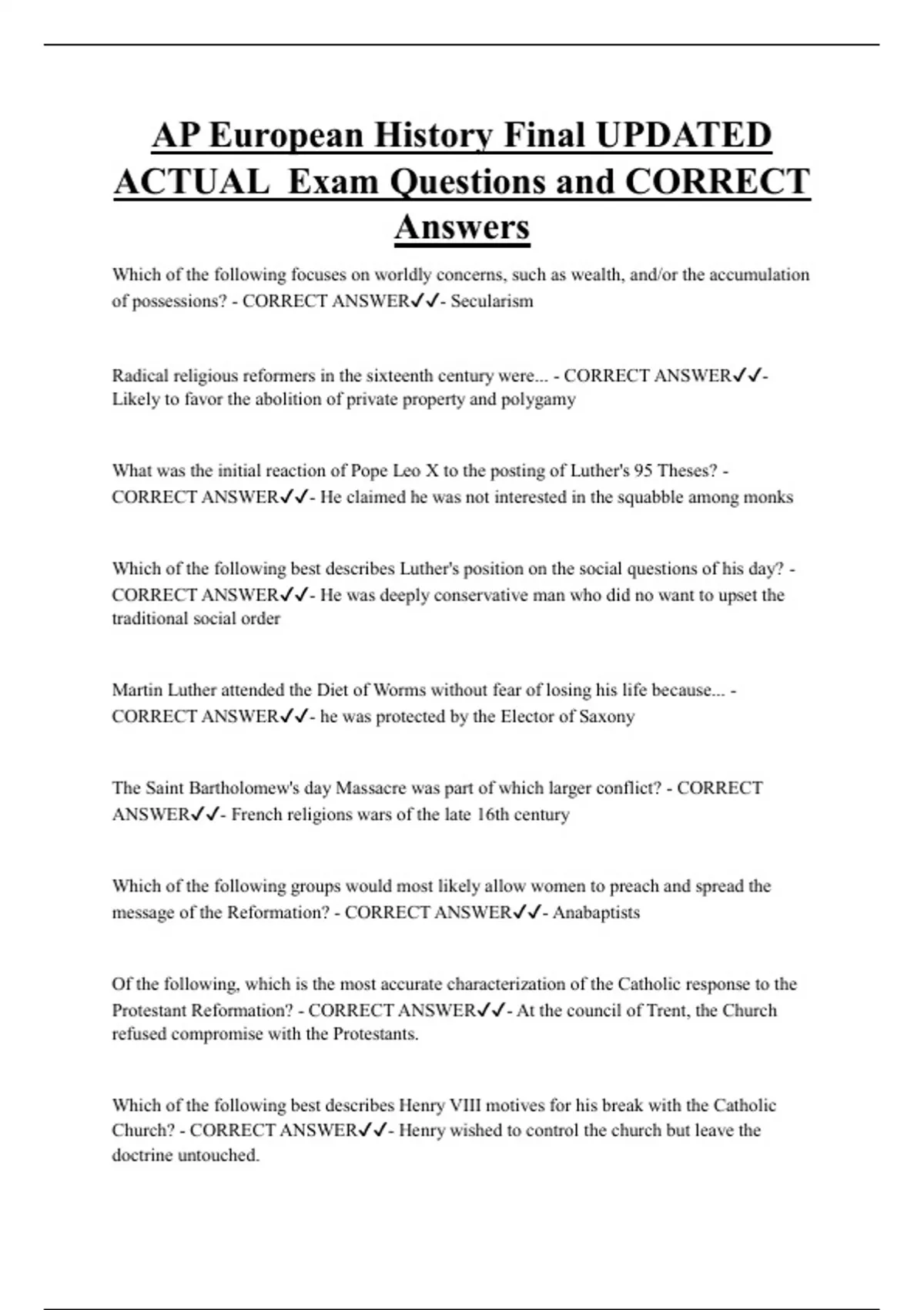AP European History Final UPDATED ACTUAL Exam Questions and CORRECT Answers Which of the following focuses on worldly concerns, such as wealth, and/or the accumulation of possessions? - CORRECT ANSWER- Secularism Radical religious reformers in the sixteenth century were... - CORRECT ANSWER- Likely to favor the abolition of private property and polygamy