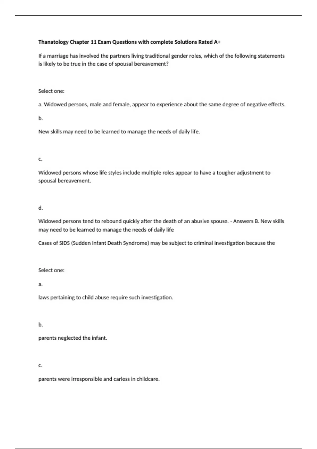 Thanatology Chapter 11 Exam Questions with complete Solutions Rated A+ If a marriage has involved the partners living traditional gender roles, which of the following statements is likely to be true in the case of spousal bereavement? Select one: a. Widowed persons, male and female, appear to experience about the same degree of negative effects. b. New skills may need to be learned to manage the needs of daily life. c. Widowed persons whose life styles include multiple roles appear to have a tougher adjustment to spousal bereavement. d. Widowed persons tend to rebound quickly after the death of an abusive spouse. - Answers B. New skills may need to be learned to manage the needs of daily life Cases of SIDS (Sudden Infant Death Syndrome) may be subject to criminal investigation because the Select one: a. laws pertaining to child abuse require such investigation. b. parents neglected the infant. c. parents were irresponsible and carless in childcare. d. infant died of unknown causes. - Answers D. Infant died of unknown causes Which of the following statements are TRUE about parental bereavement in couples? 1. A feeling of estrangement and a strong bond can occur between the parents at the same time. 2. A partner's behavior can be misinterpreted by the other and can cause conflict. 3. Different grieving styles may decrease the couple's sense of commonality. 4. Urging each other to be strong in public is an important component of getting past the grieving phase and into the healing phase of bereavement. Select one: a. 2, 3, and 4 b. 1, 2, and 3 c. 1, 3, and 4 d. 1, 2, and 4 - Answers B. 1, 2, and 3 True or false Women who choose to have an induced abortion will not experience a grief reaction. - Answers False True or false Widowed persons whose lifestyles include multiple roles appear to make an easier adjustment than do those with fewer roles. - Answers True True or false The death of a parent may cause a person to realize that he or she has become an adult - Answers True True or false The distinction between miscarriage and stillbirth is based on the logic that most fetuses are viable after the 20th week of pregnancy. - Answers True True or false According to Rosenblatt, after a child's death parents tended to become a little more lenient and less protective of their other surviving children. - Answers False Senescence is Select one: a. the process of becoming old. b. dating amongst the aged. c. reaching 80 years old. d. loss of senses. - Answers A. Process of becoming old True or false Childbearing loss includes the birth of a child with a severe impairment or a mental disability -
