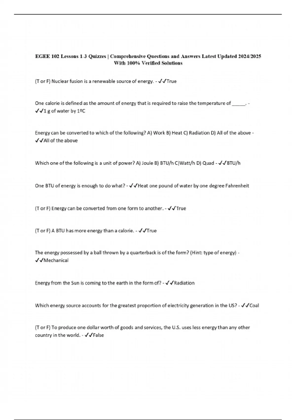 EGEE 102 Lessons 1-3 Quizzes | Comprehensive Questions and Answers Latest Updated 2024/2025 With 100% Verified Solutions