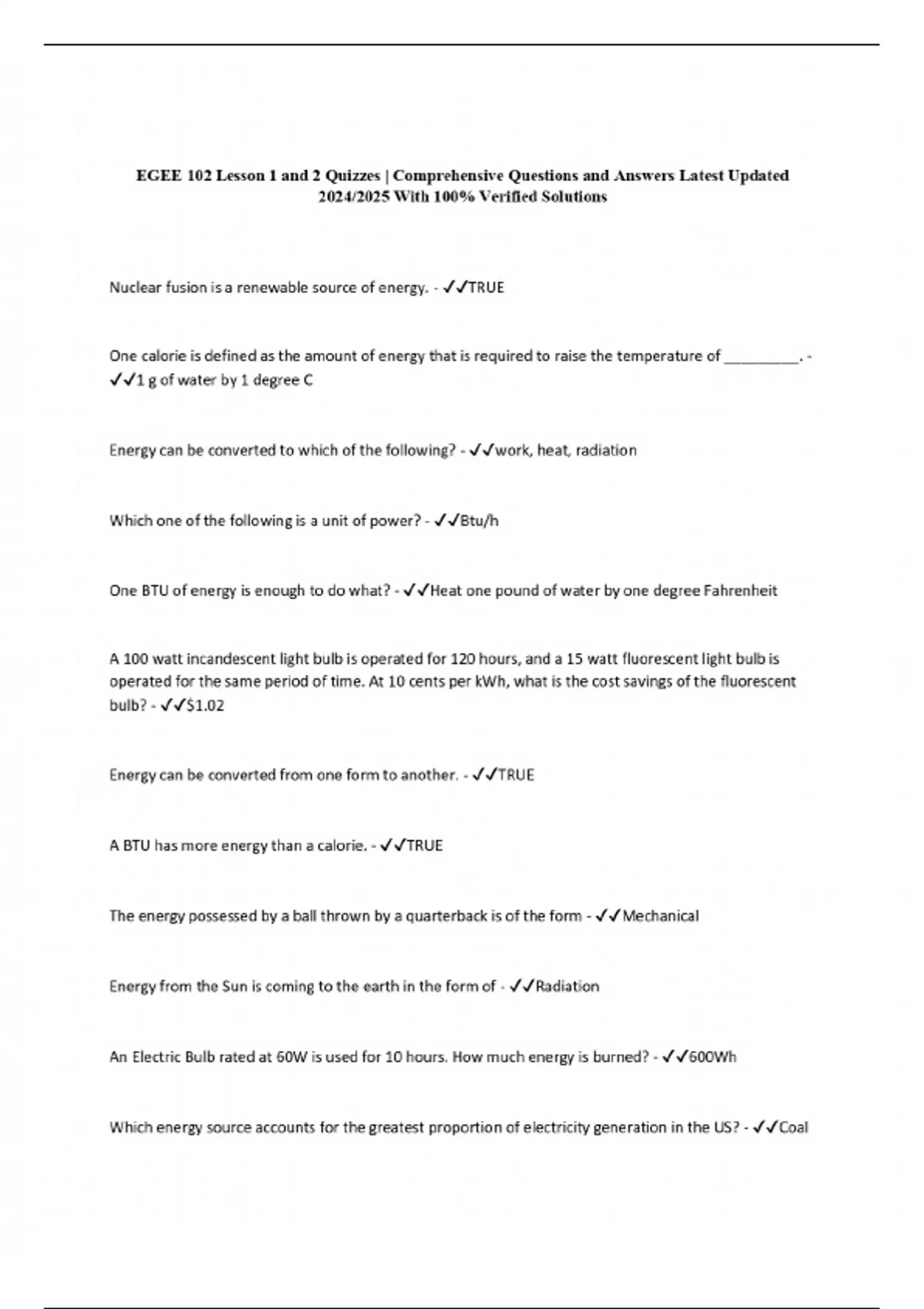 EGEE 102 Lesson 1 and 2 Quizzes | Comprehensive Questions and Answers Latest Updated 2024/2025 With 100% Verified Solutions