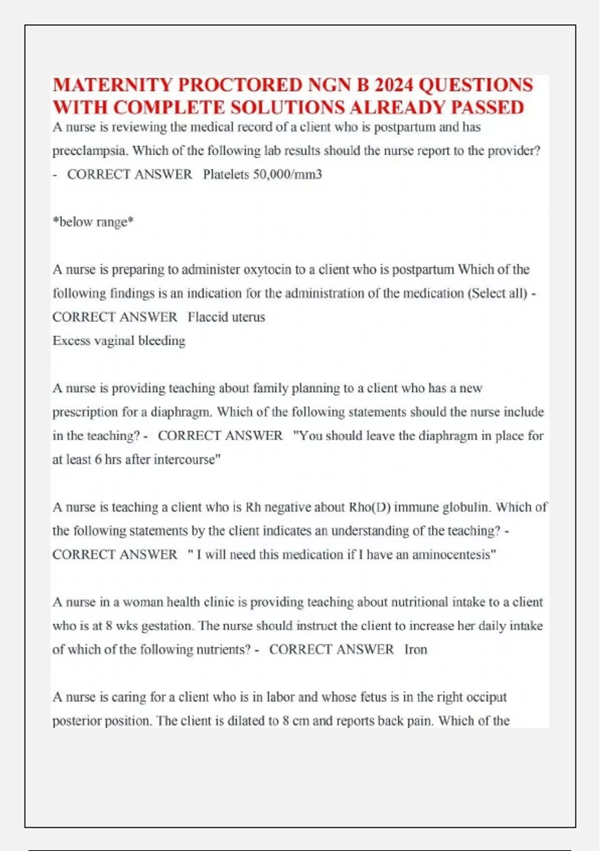 MATERNITY PROCTORED NGN B 2024 QUESTIONS WITH COMPLETE SOLUTIONS ALREADY PASSED