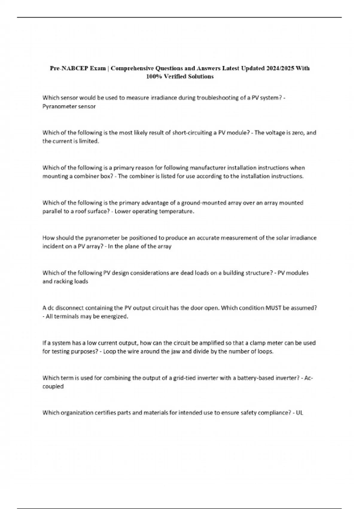 Pre-NABCEP Exam | Comprehensive Questions and Answers Latest Updated 2024/2025 With 100% Verified Solutions