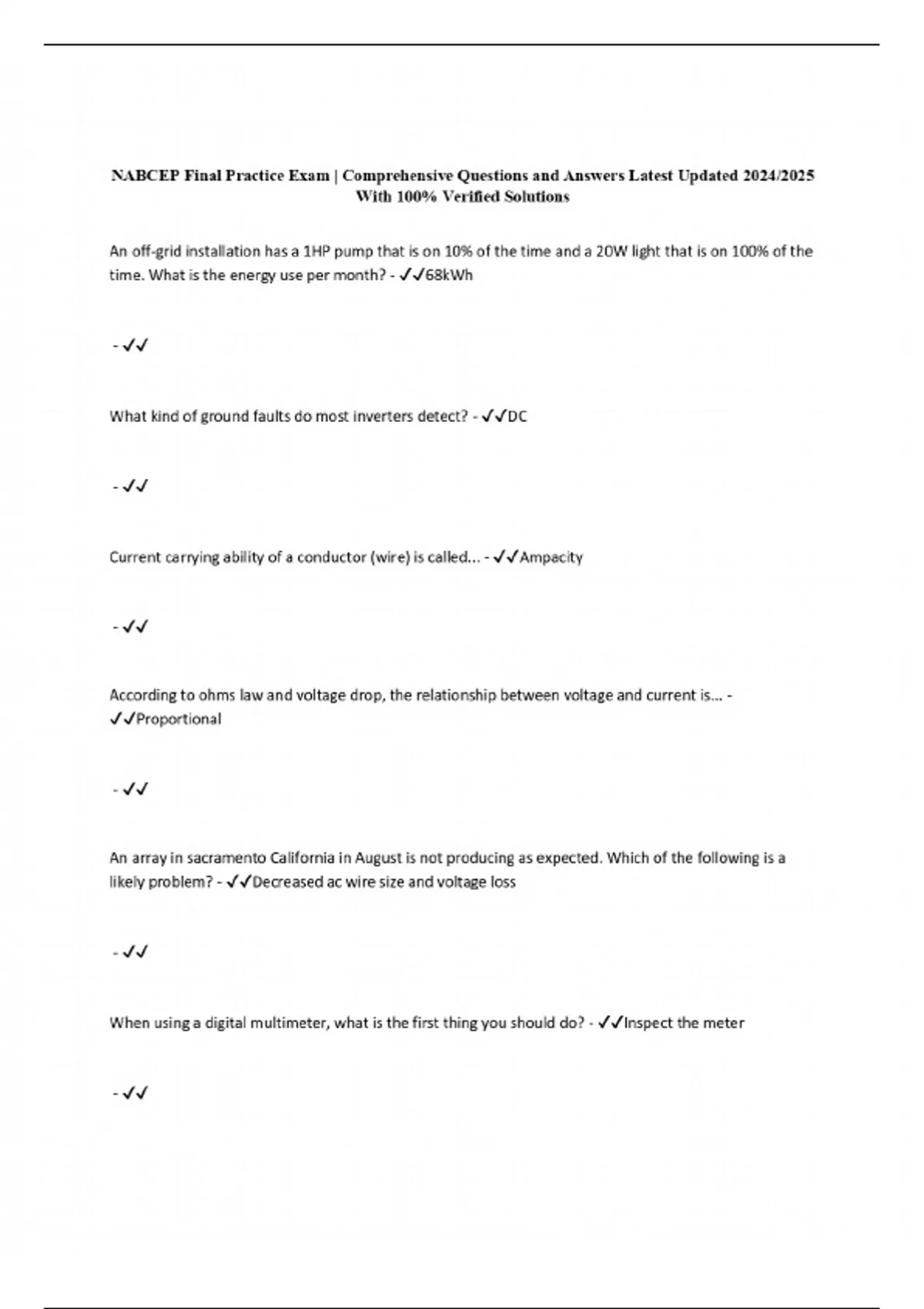 NABCEP Final Practice Exam | Comprehensive Questions and Answers Latest Updated 2024/2025 With 100% Verified Solutions