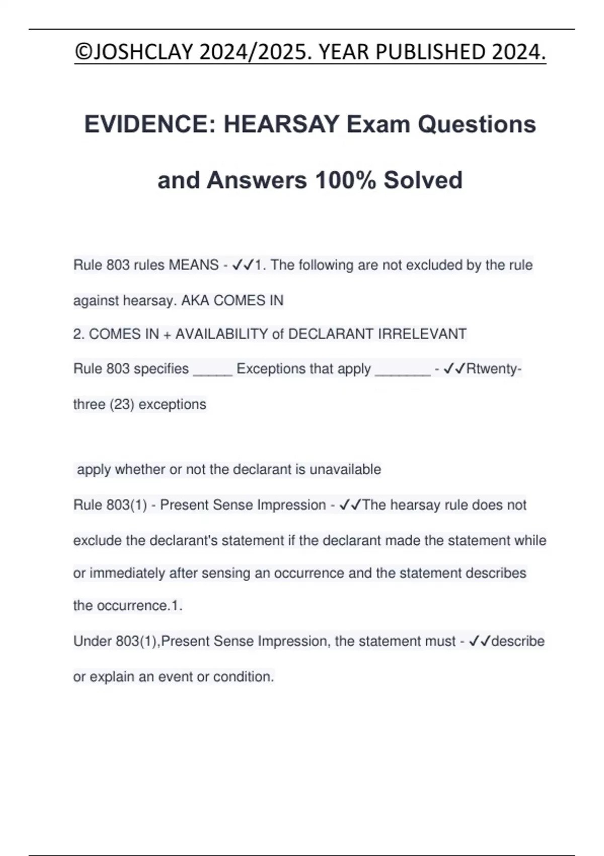 EVIDENCE: HEARSAY Exam Questions and Answers 100% Solved Rule 803 rules MEANS - 1. The following are not excluded by the rule against hearsay. AKA COMES IN 2. COMES IN + AVAILABILITY of DECLARANT IRRELEVANT Rule 803 specifies _____ Exceptions that apply _______ - Rtwentythree (23) exceptions apply whether or not the declarant is unavailable Rule 803(1) - Present Sense Impression - The hearsay rule does not exclude the declarant's statement if the declarant made the statement while or immediately after sensing an occurrence and the statement describes the occurrence.1. Under 803(1),Present Sense Impression, the statement must - describe or explain an event or condition.