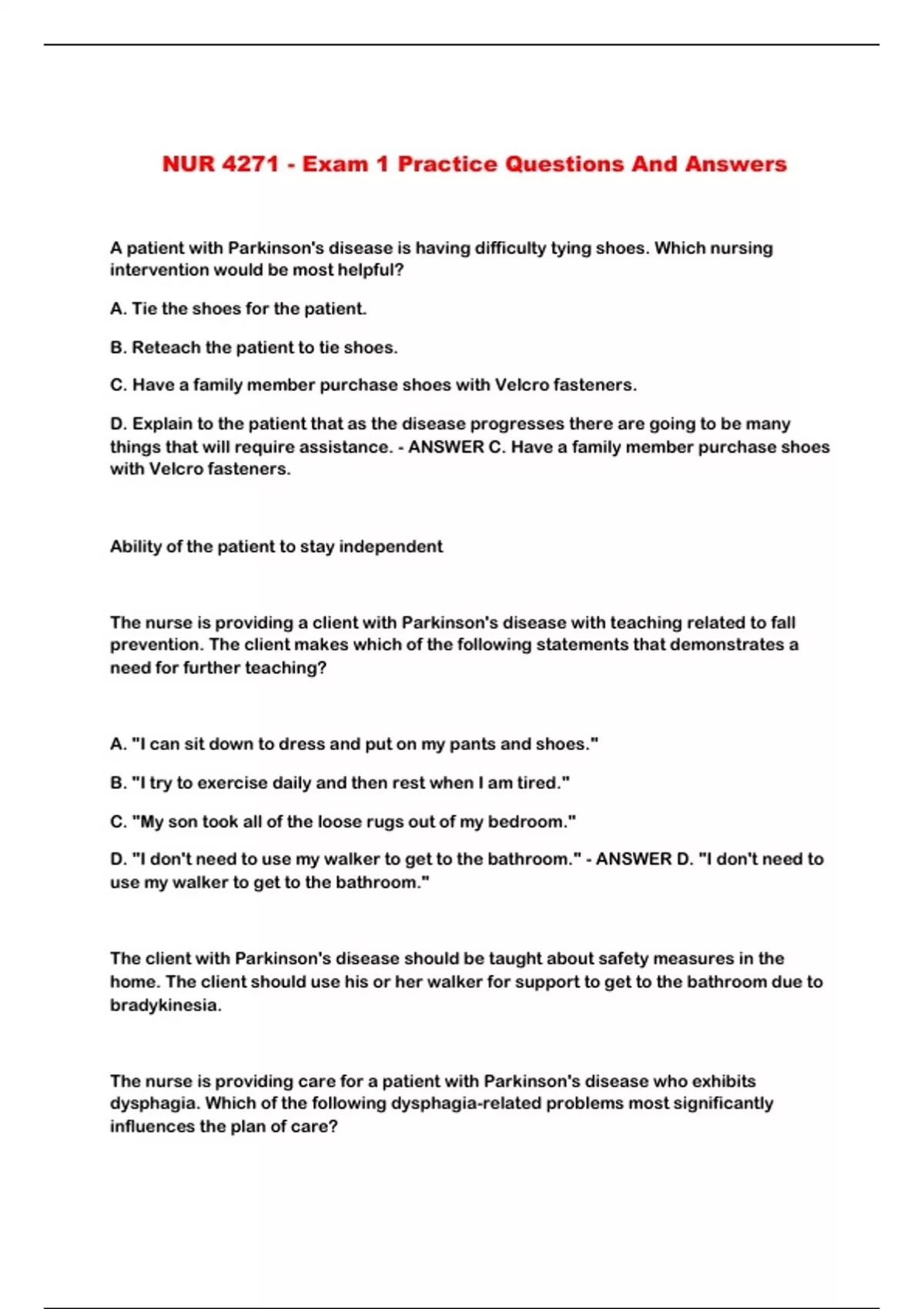 NUR 4271 - Exam 1 Practice Questions And Answers