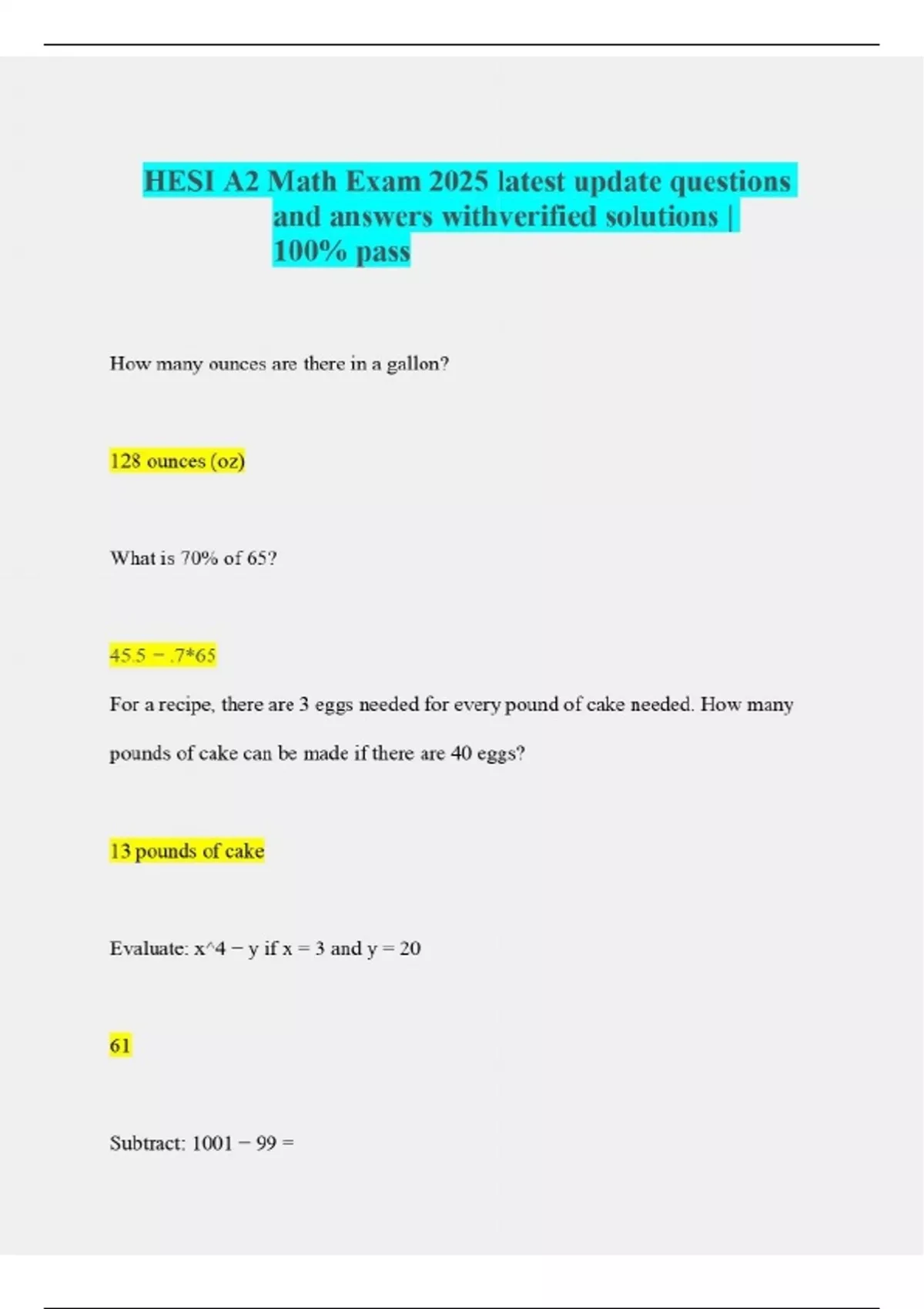 HESI A2 Math Exam 2025 latest update questions and answers withverified solutions | 100% pass