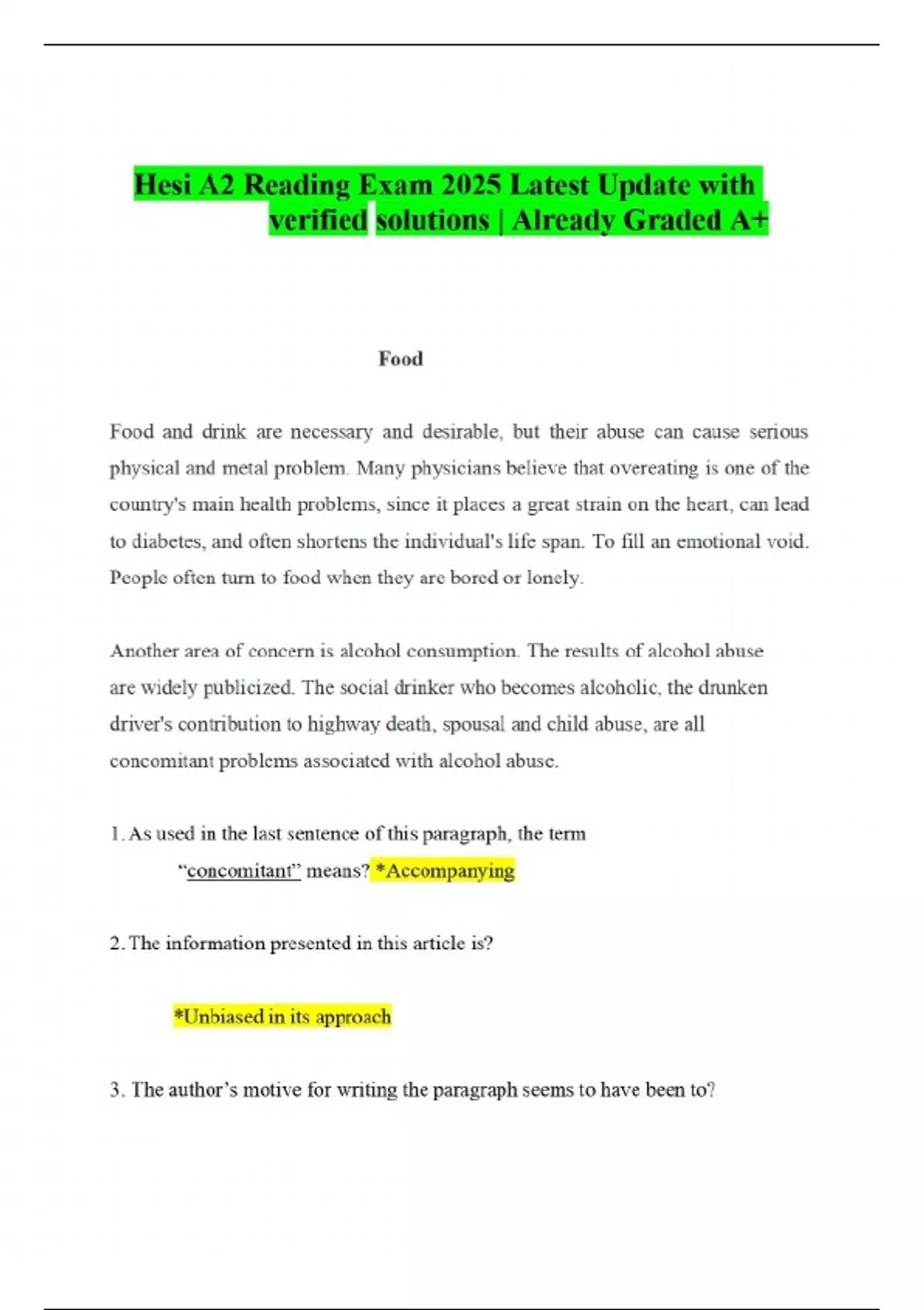 Hesi A2 Reading Exam 2025 Latest Update with verified solutions | Already Graded A+