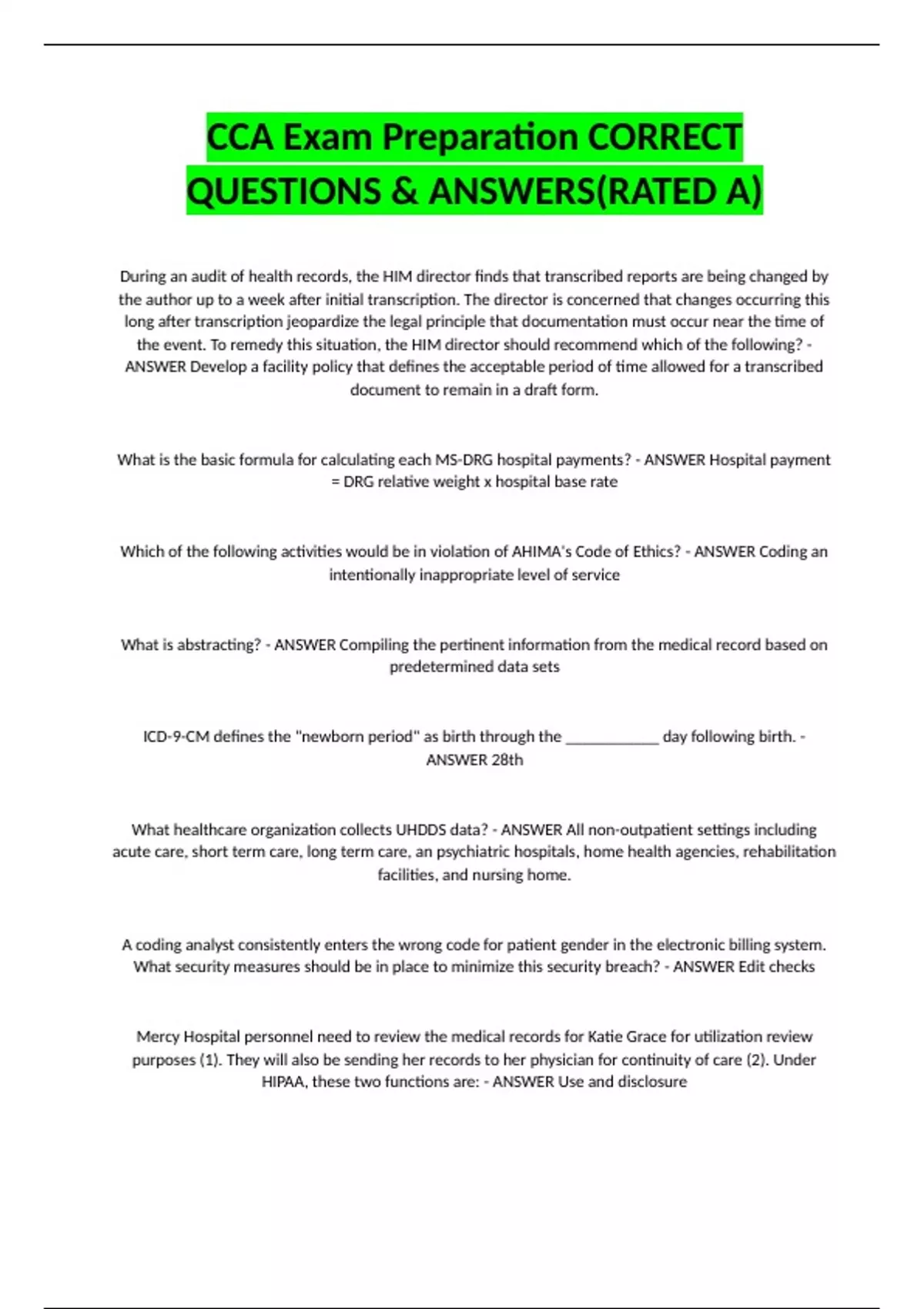 During an audit of health records, the HIM director finds that transcribed reports are being changed by the author up to a week after initial transcription. The director is concerned that changes occurring this long after transcription jeopardize the legal principle that documentation must occur near the time of the event. To remedy this situation, the HIM director should recommend which of the following? - ANSWER Develop a facility policy that defines the acceptable period of time allowed for a transcribed document to remain in a draft form. What is the basic formula for calculating each MS-DRG hospital payments? - ANSWER Hospital payment = DRG relative weight x hospital base rate Which of the following activities would be in violation of AHIMA's Code of Ethics? - ANSWER Coding an intentionally inappropriate level of service