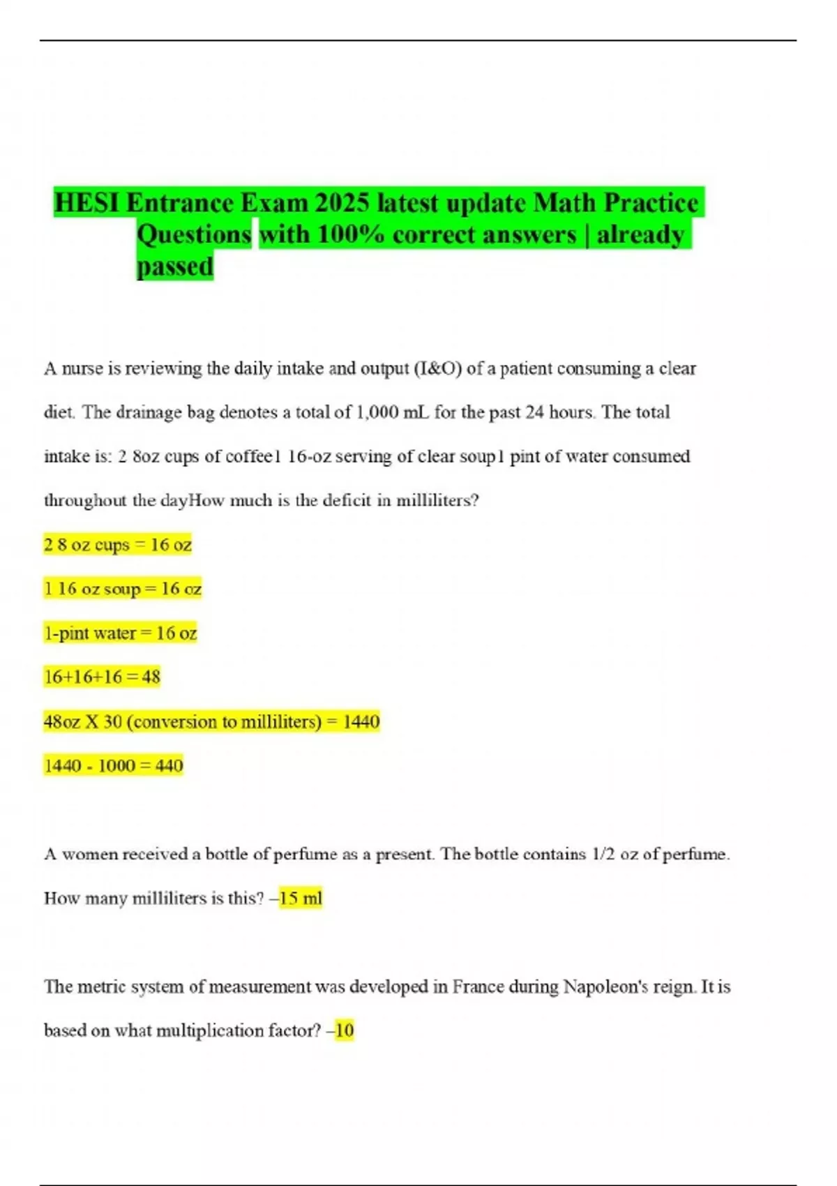 HESI Entrance Exam 2025 latest update Math Practice Questions with 100% correct answers | already passed