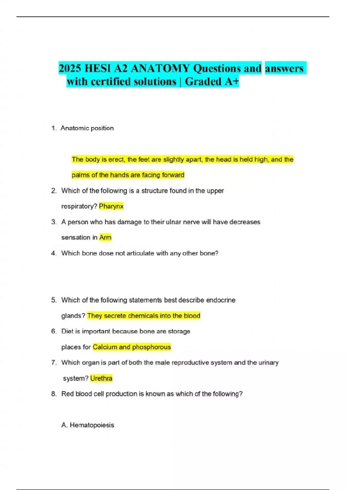 2025 HESI A2 ANATOMY Questions and answers with certified solutions | Graded A+