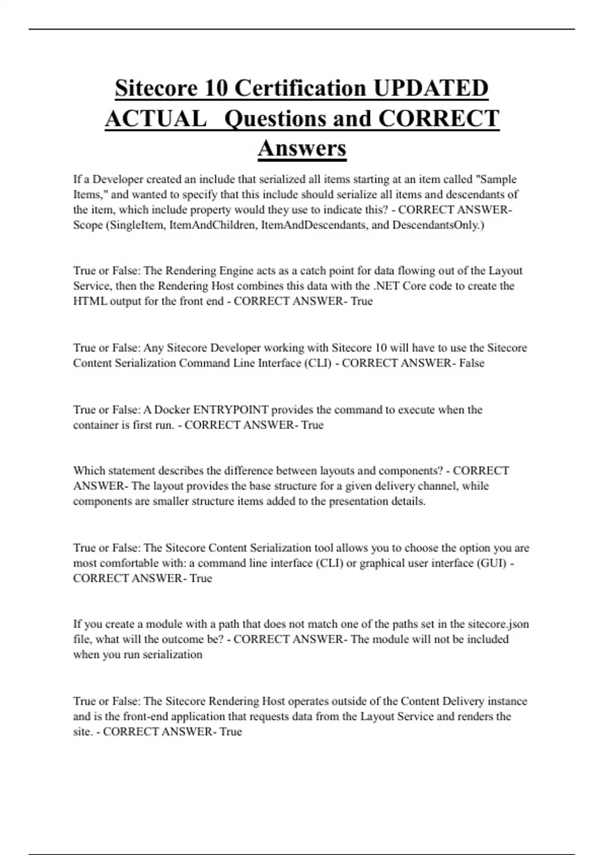 Sitecore 10 Certification UPDATED ACTUAL Questions and CORRECT Answers If a Developer created an include that serialized all items starting at an item called "Sample Items," and wanted to specify that this include should serialize all items and descendants of the item, which include property would they use to indicate this? - CORRECT ANSWERScope (SingleItem, ItemAndChildren, ItemAndDescendants, and DescendantsOnly.) True or False: The Rendering Engine acts as a catch point for data flowing out of the Layout Service, then the Rendering Host combines this data with the .NET Core code to create the HTML output for the front end - CORRECT ANSWER- True