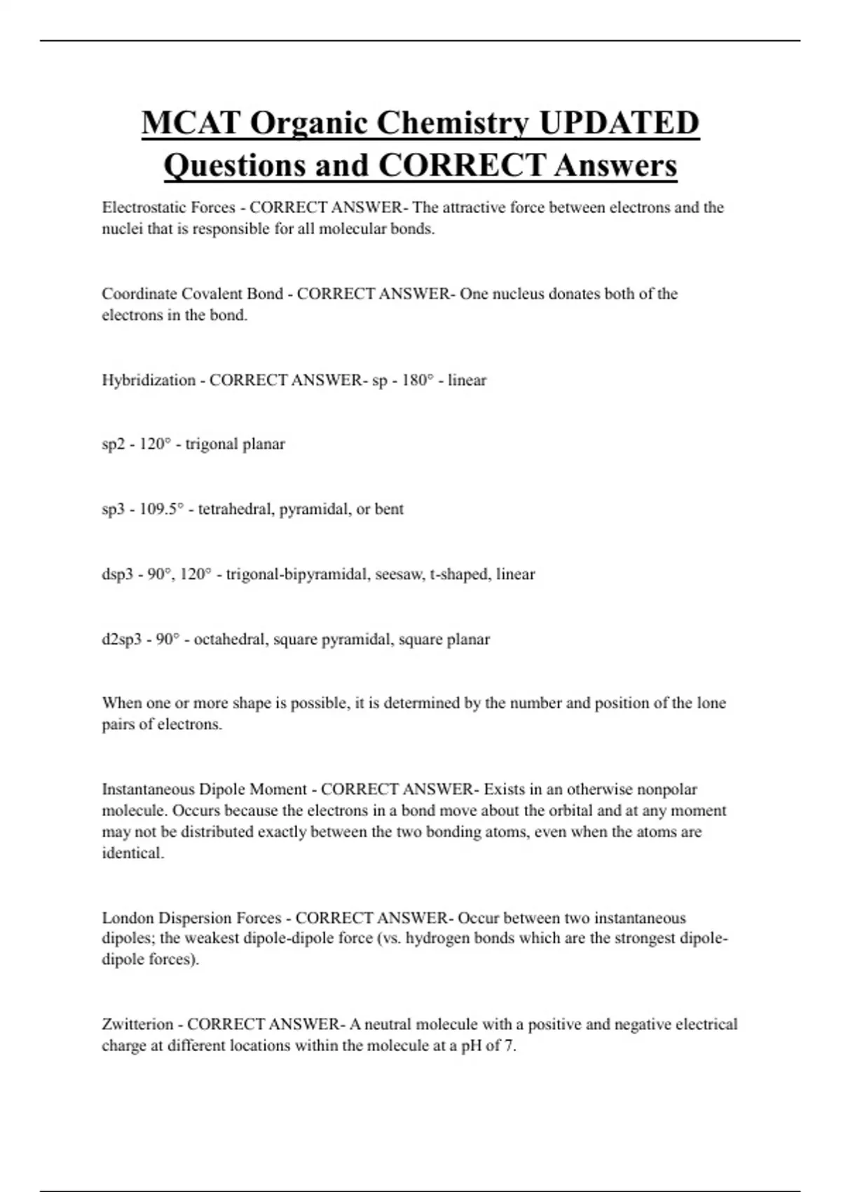MCAT Organic Chemistry UPDATED Questions and CORRECT Answers Electrostatic Forces - CORRECT ANSWER- The attractive force between electrons and the nuclei that is responsible for all molecular bonds. Coordinate Covalent Bond - CORRECT ANSWER- One nucleus donates both of the electrons in the bond. Hybridization - CORRECT ANSWER- sp - 180° - linear sp2 - 120° - trigonal planar sp3 - 109.5° - tetrahedral, pyramidal, or bent
