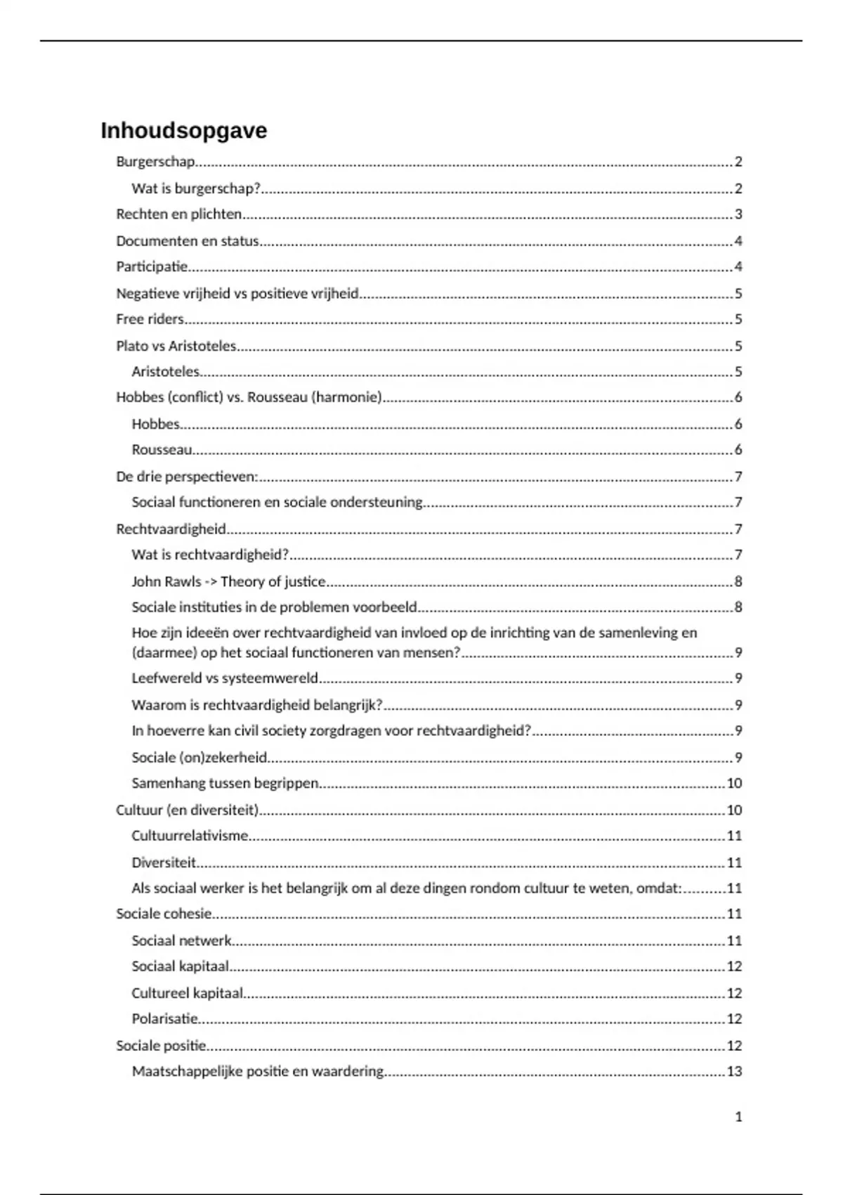 In dit document staat van alles: burgerschap, rechten en plichten, documenten en status, participatie, negatieve en positieve vrijheid, free riders, Plato vs. Aristoteles, Hobbes vs. Rousseau, empowerment, rechtvaardigheid (bijvoorbeeld theory of justice en sluier van ontwetendheid, leefwereld vs systeemwereld en sociale (on)zekerheid), cultuur en diversiteit, sociale cohesie, sociale positie en identiteit. Ook is er een voorbeeld geschreven hoe je een casus kunt bekijken vanuit deze begrippen. De informatie uit het document is een combinatie tussen zelf gevonden informatie en gekregen informatie tijdens de lessen.