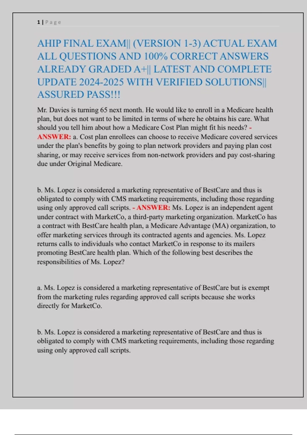 AHIP FINAL EXAM|| (VERSION 1-3) ACTUAL EXAM
