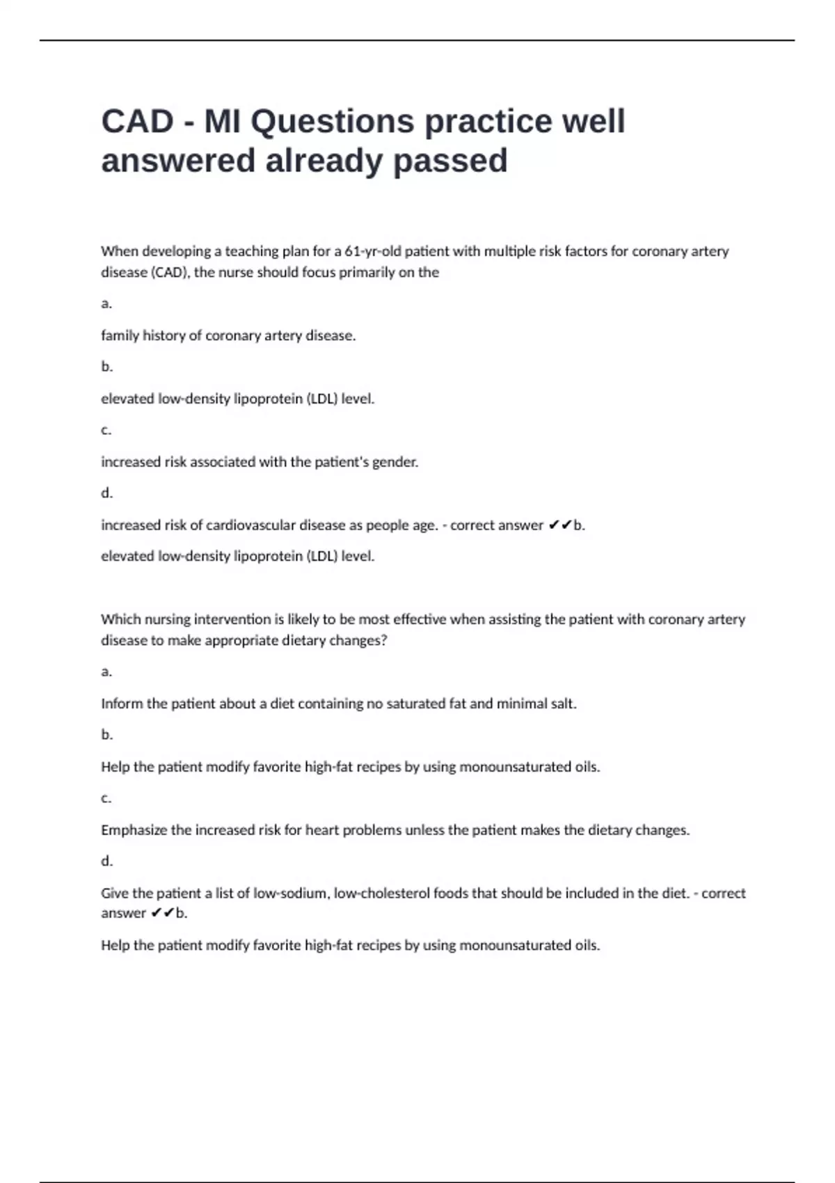CAD - MI Questions practice well answered already passed