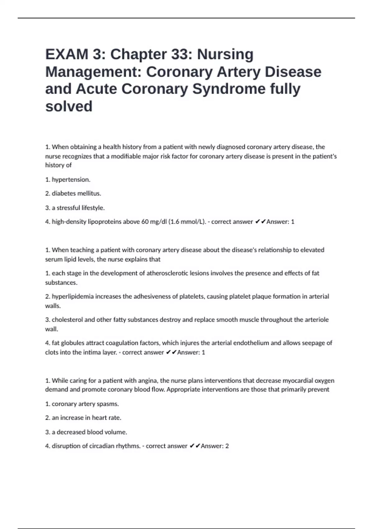1. While caring for a patient with angina, the nurse plans interventions that decrease myocardial oxygen