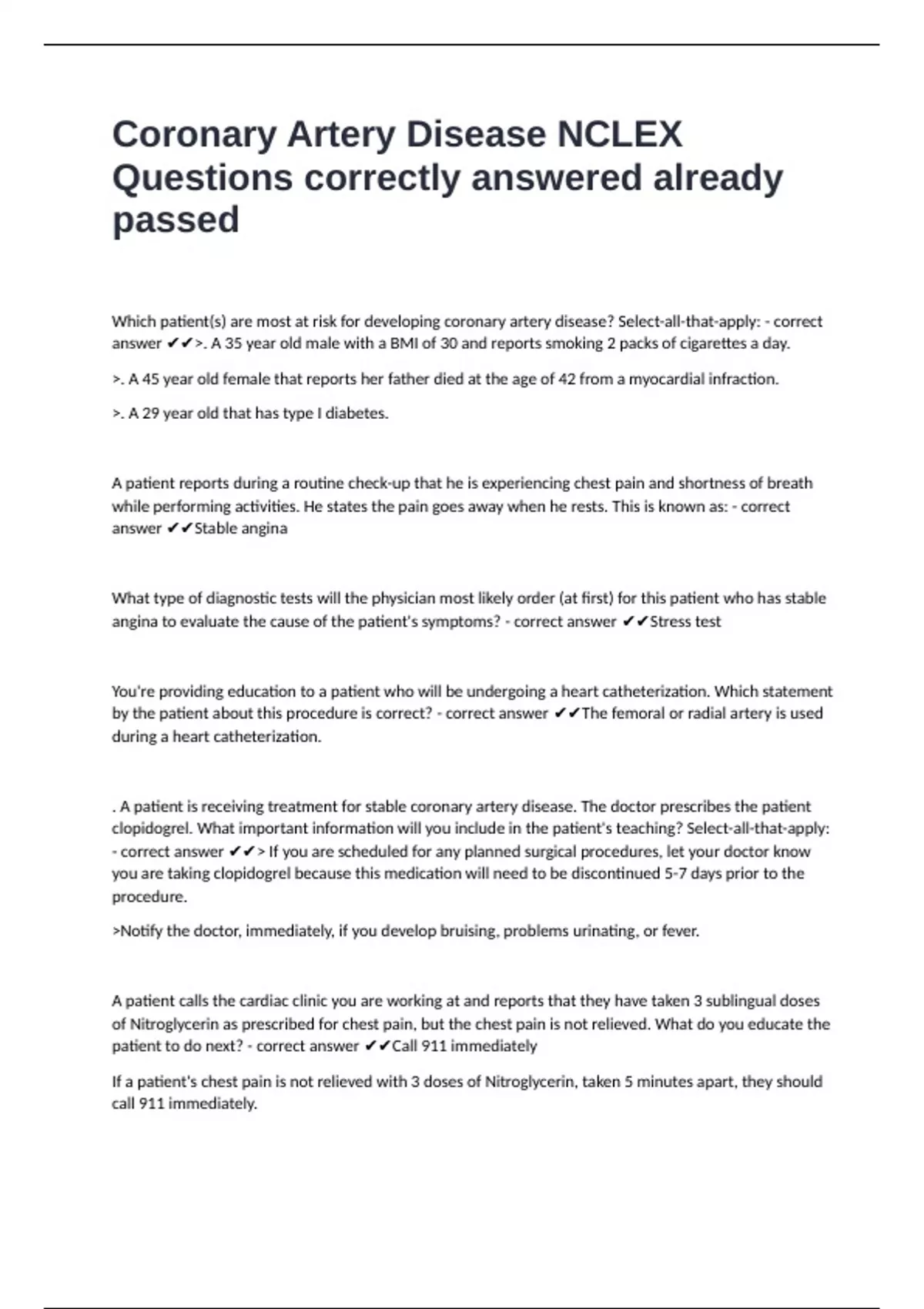 Coronary Artery Disease NCLEX Questions correctly answered already passed