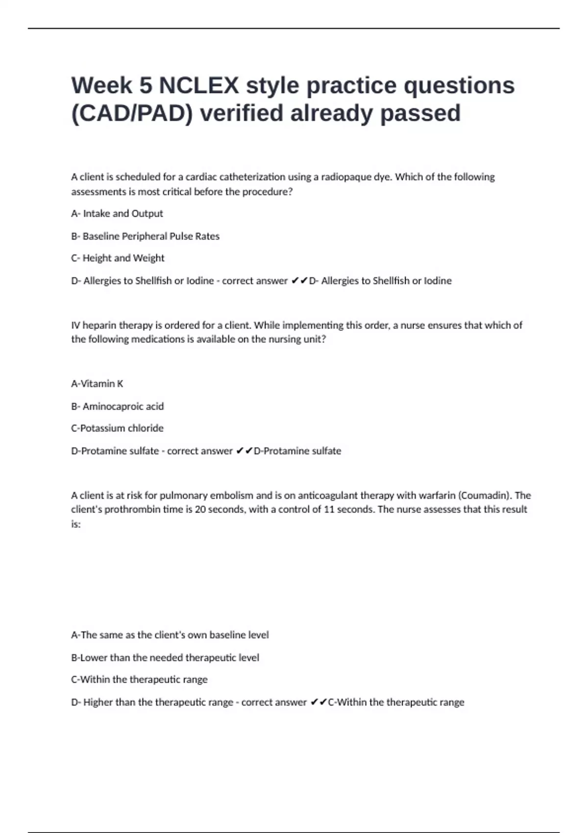 Week 5 NCLEX style practice questions (CAD/PAD) verified already passed