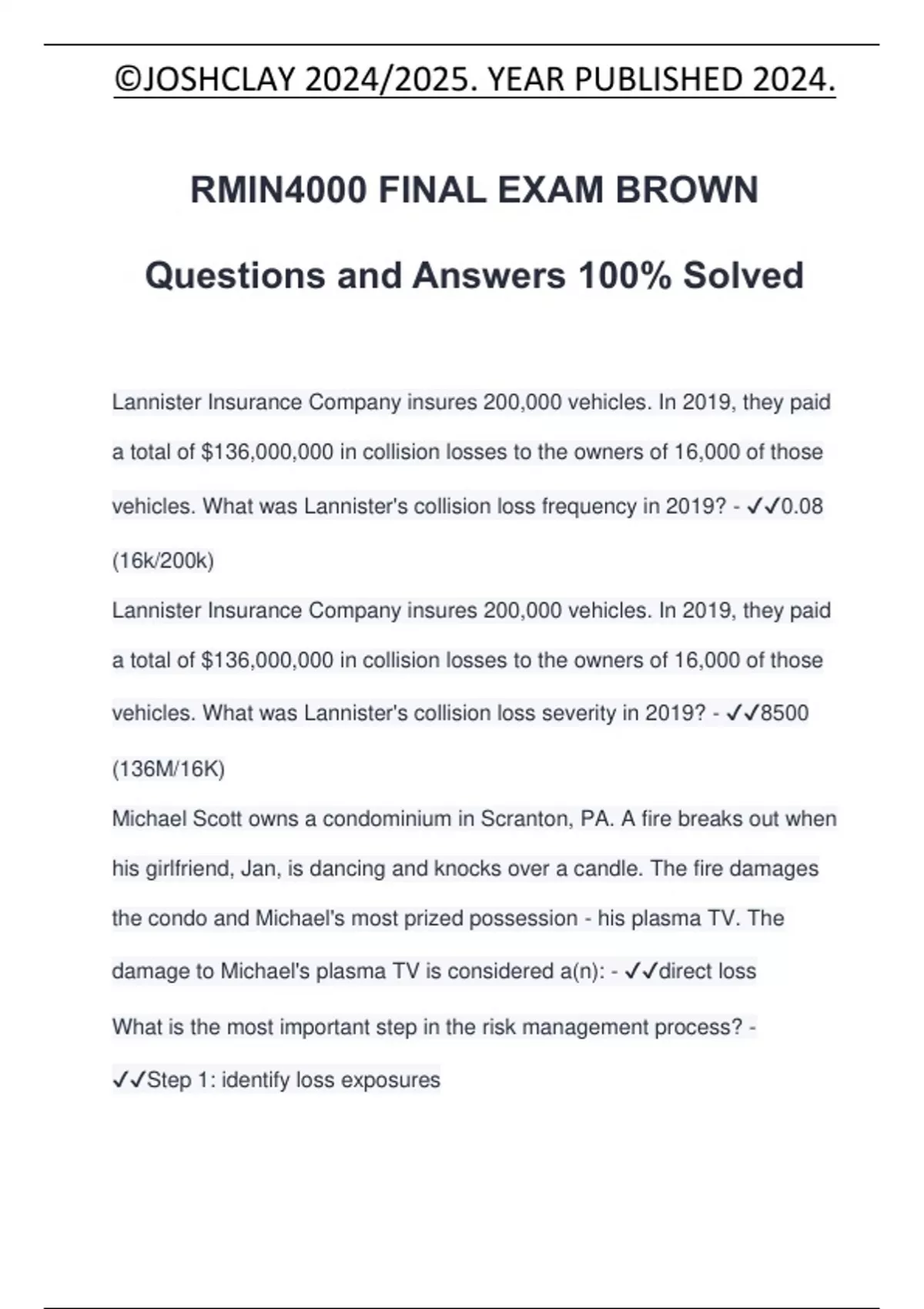 RMIN4000 FINAL EXAM BROWN Questions and Answers 100% Solved Lannister Insurance Company insures 200,000 vehicles. In 2019, they paid a total of $136,000,000 in collision losses to the owners of 16,000 of those vehicles. What was Lannister's collision loss frequency in 2019? - 0.08 (16k/200k) Lannister Insurance Company insures 200,000 vehicles. In 2019, they paid a total of $136,000,000 in collision losses to the owners of 16,000 of those vehicles. What was Lannister's collision loss severity in 2019? - 8500 (136M/16K) Michael Scott owns a condominium in Scranton, PA. A fire breaks out when his girlfriend, Jan, is dancing and knocks over a candle. The fire damages the condo and Michael's most prized possession - his plasma TV. The damage to Michael's plasma TV is considered a(n): - direct loss What is the most important step in the risk management process? - Step 1: identify loss exposures