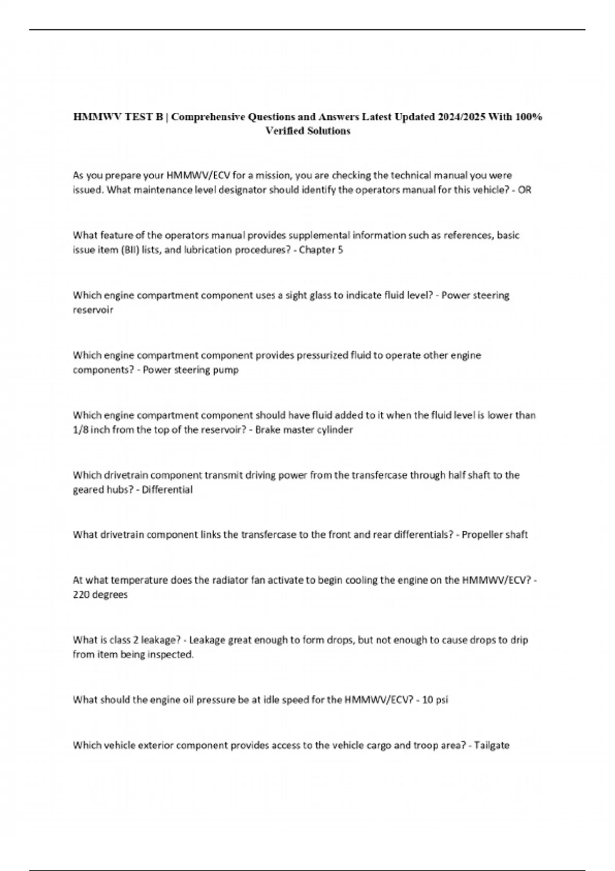 HMMWV TEST B | Comprehensive Questions and Answers Latest Updated 2024/2025 With 100% Verified Solution