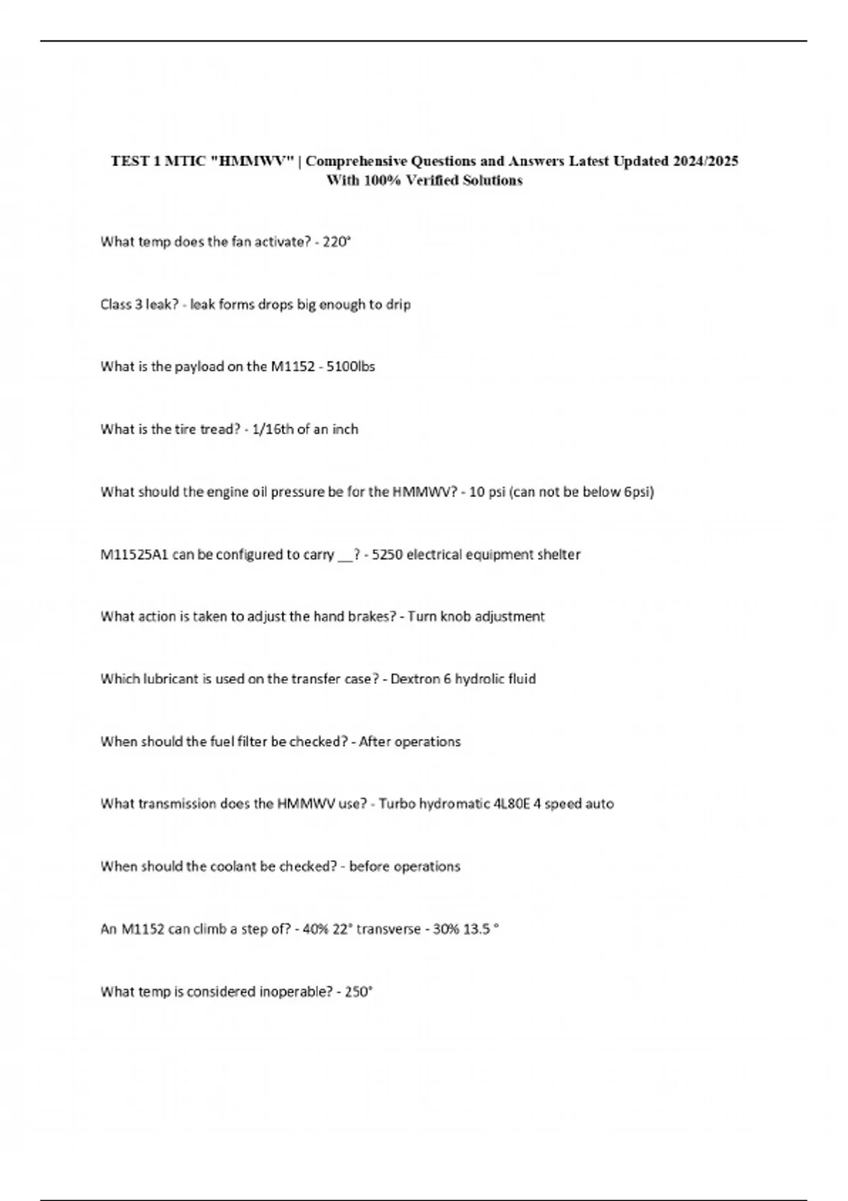 TEST 1 MTIC "HMMWV" | Comprehensive Questions and Answers Latest Updated 2024/2025 With 100% Verified Solutions