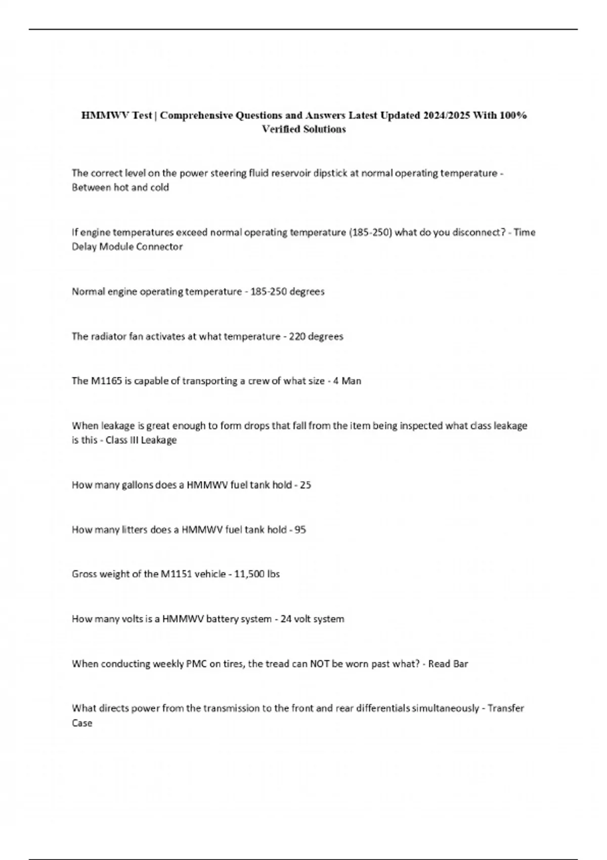 HMMWV Test | Comprehensive Questions and Answers Latest Updated 2024/2025 With 100% Verified Solutions
