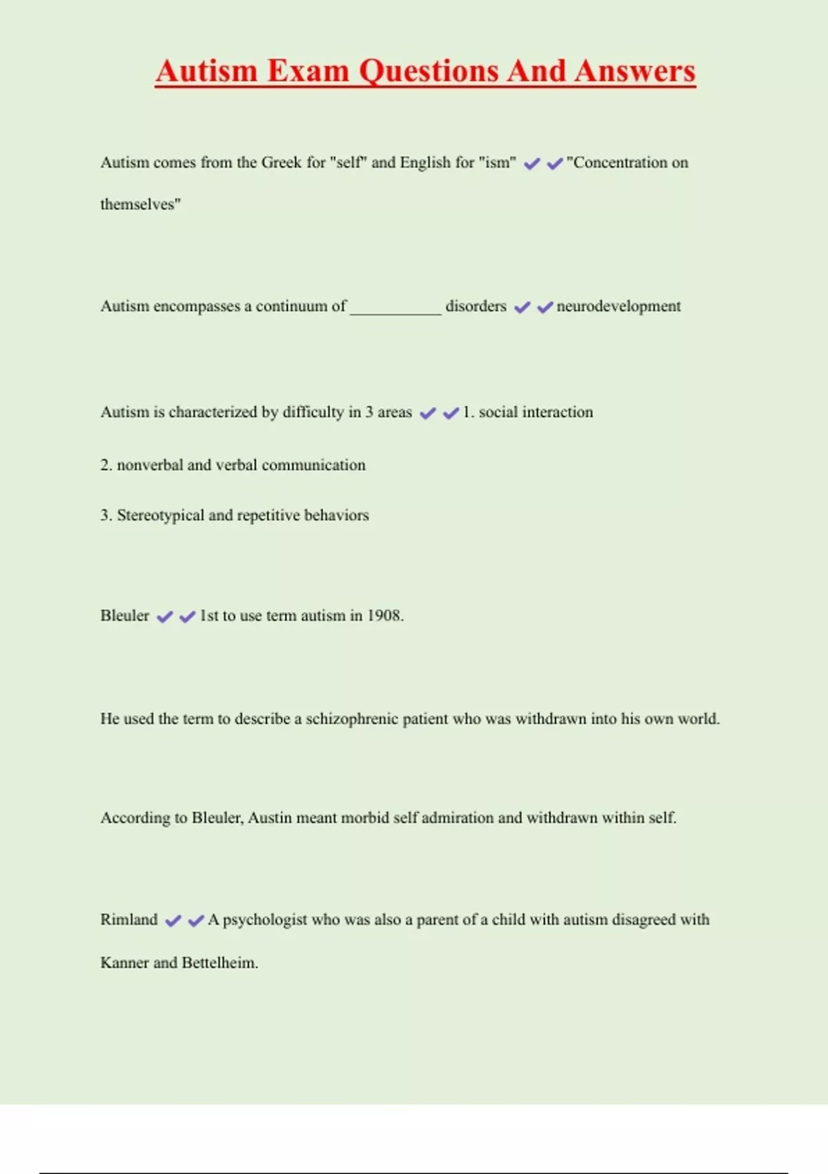 Autism Exam Questions And Answers Autism comes from the Greek for "self" and English for "ism" "Concentration on themselves" Autism encompasses a continuum of ___________ disorders neurodevelopment Autism is characterized by difficulty in 3 areas 1. social interaction 2. nonverbal and verbal communication 3. Stereotypical and repetitive behaviors Bleuler 1st to use term autism in 1908. He used the term to describe a schizophrenic patient who was withdrawn into his own world. According to Bleuler, Austin meant morbid self admiration and withdrawn within self