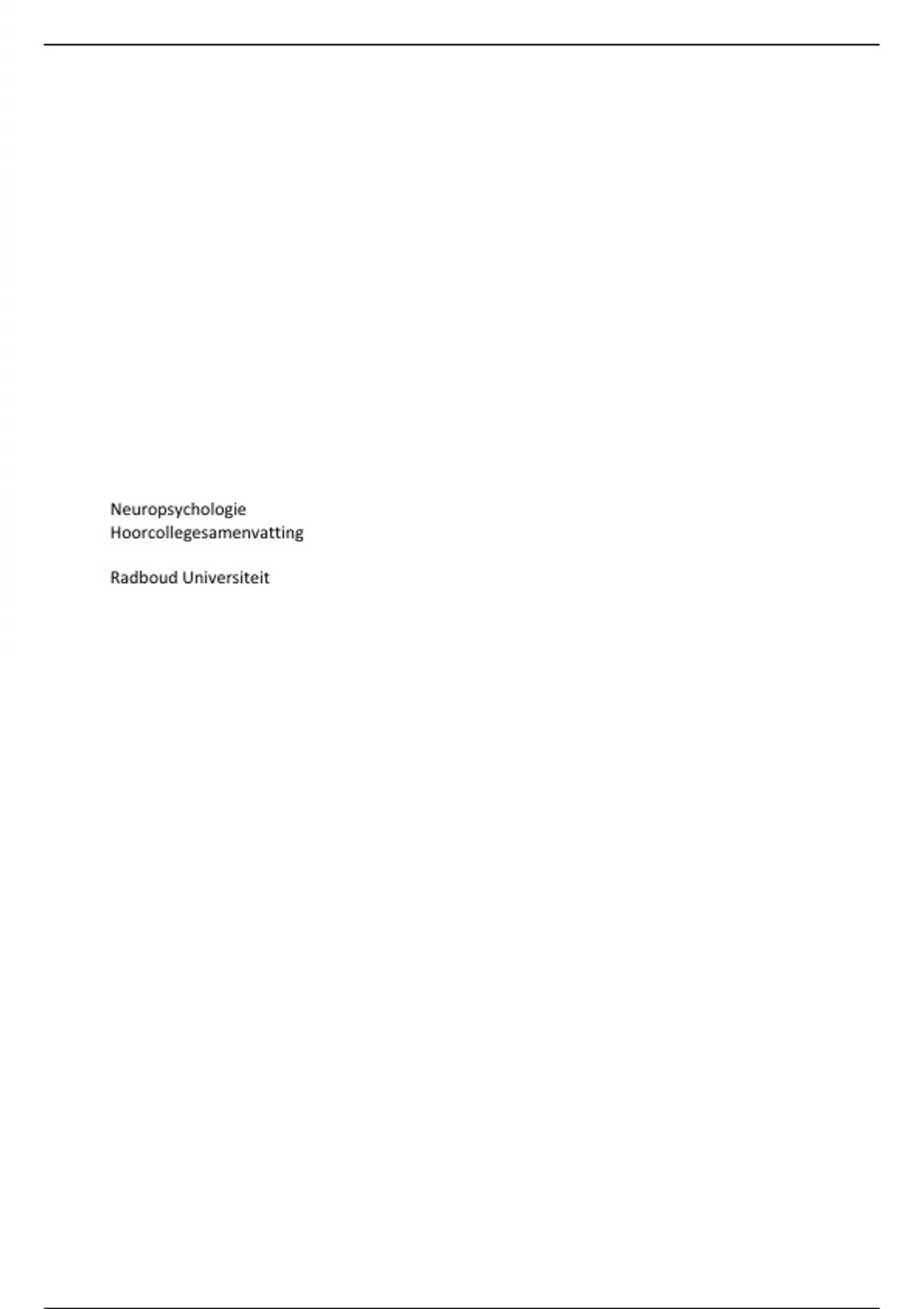 Ontdek de complete samenvatting van de hoorcolleges Neuropsychologie – jouw essentiële hulpmiddel voor een lastig tentamen. Alle belangrijke collegestof wordt helder en overzichtelijk uitgelegd, zodat je precies weet wat je moet leren om te slagen. Bereid je optimaal voor en vergroot je kans op succes met deze samenvatting!