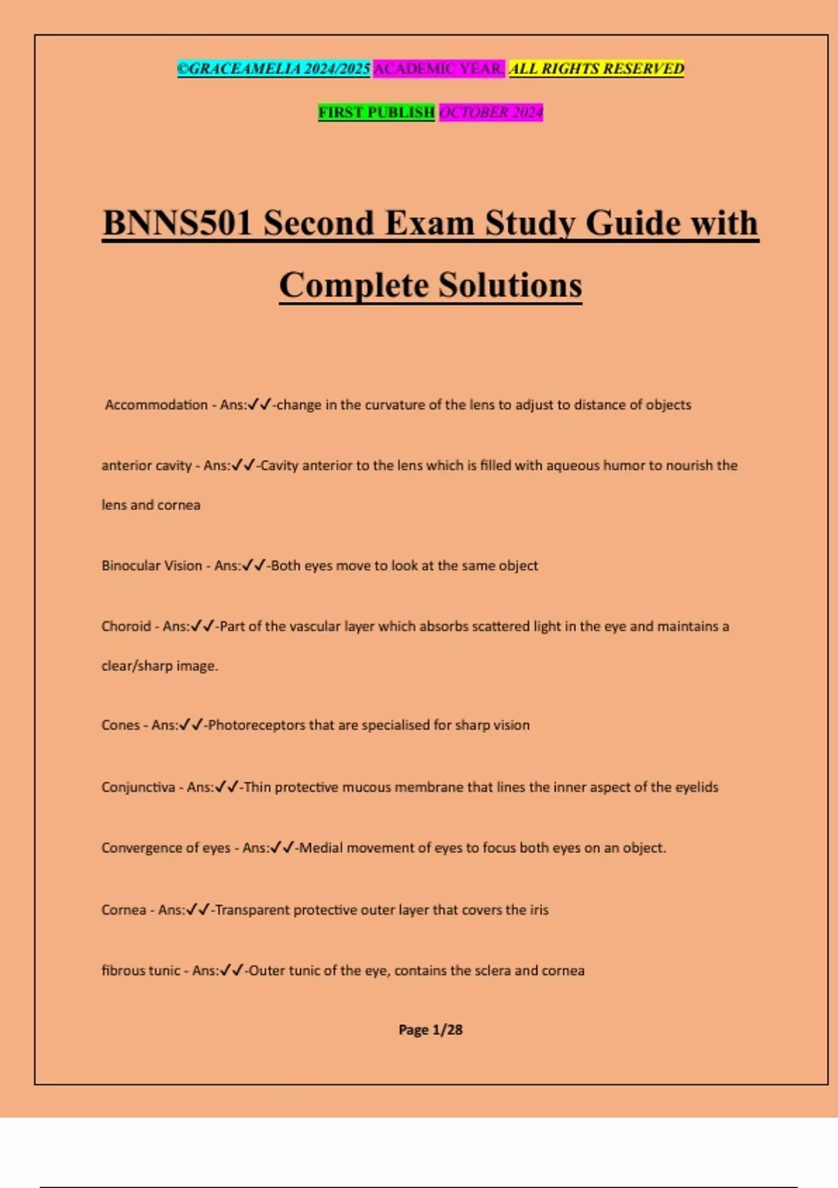Convergence of eyes - Ans:✔✔-Medial movement of eyes to focus both eyes on an object.