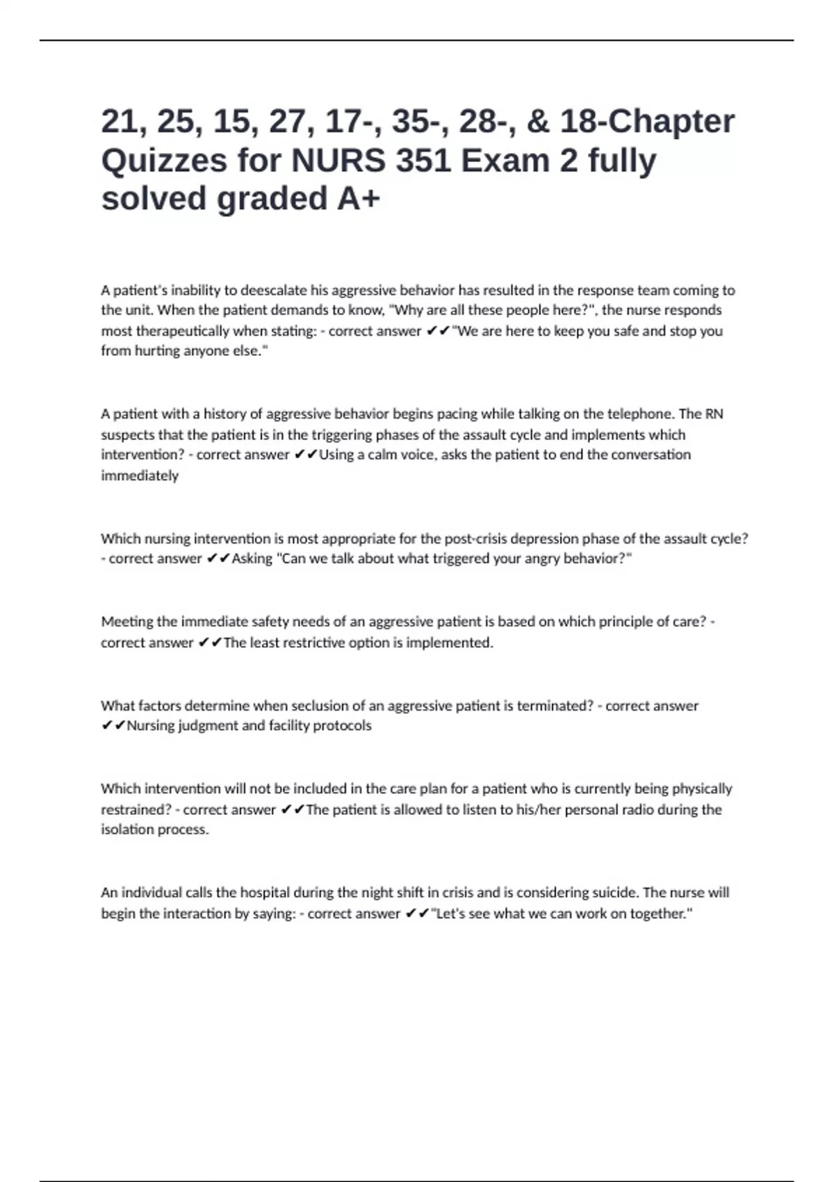 21, 25, 15, 27, 17-, 35-, 28-, & 18-Chapter Quizzes for NURS 351 Exam 2 fully solved graded A+