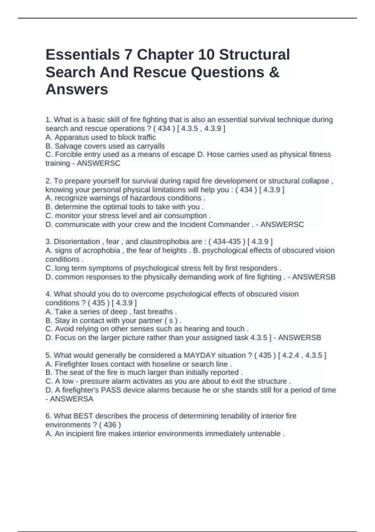 1. What is a basic skill of fire fighting that is also an essential survival technique during search and rescue operations ? ( 434 ) [ 4.3.5 , 4.3.9 ] A. Apparatus used to block traffic B. Salvage covers used as carryalls C. Forcible entry used as a means of escape D. Hose carries used as physical fitness training - ANSWERSC 2. To prepare yourself for survival during rapid fire development or structural collapse , knowing your personal physical limitations will help you : ( 434 ) [ 4.3.9 ] A. recognize warnings of hazardous conditions . B. determine the optimal tools to take with you . C. monitor your stress level and air consumption . D. communicate with your crew and the Incident Commander . - ANSWERSC 3. Disorientation , fear , and claustrophobia are : ( 434-435 ) [ 4.3.9 ] A. signs of acrophobia , the fear of heights . B. psychological effects of obscured vision conditions . C. long term symptoms of psychological stress felt by first responders . D. common responses to the physically demanding work of fire fighting . - ANSWERSB 4. What should you do to overcome psychological effects of obscured vision conditions ? ( 435 ) [ 4.3.9 ] A. Take a series of deep , fast breaths . B. Stay in contact with your partner ( s ) . C. Avoid relying on other senses such as hearing and touch . D. Focus on the larger picture rather than your assigned task 4.3.5 ] - ANSWERSB 5. What would generally be considered a MAYDAY situation ? ( 435 ) [ 4.2.4 , 4.3.5 ] A. Firefighter loses contact with hoseline or search line . B. The seat of the fire is much larger than initially reported . C. A low - pressure alarm activates as you are about to exit the structure . D. A firefighter's PASS device alarms because he or she stands still for a period of time - ANSWERSA 6. What BEST describes the process of determining tenability of interior fire environments ? ( 436 ) A. An incipient fire makes interior environments immediately untenable . B. If an environment is untenable for unprotected victims , it is untenable for firefighters in full PPE and SCBA . C. Signs of structural collapse make interior operations untenable even for firefighters in full PPE and SCBA D. If the environment is tenable for firefighters in full PPE and SCBA , then it is tenable for unprotected victims - ANSWERSC 7. When identifying safe havens during search and rescue operations , firefighters should identify areas : ( 436 ) [ 4.3.5 ] A. that are well outside of the structure . B. that are large enough to house at least ten victims or firefighters C. where the door can be closed to prevent the spread of fire and smoke D. that are immediately next to the point of entry made by the fire attack company . - ANSWERSC 8. What is NOT a key principle of air management during structural search and rescue operations ? ( 437 ) [ 4.3.9 ] A. Know your point of no return . B. Always know how much air you have left . C. Inform the IC if you must exit the structure . D. Stay in the structure until the low - pressure alarm activates - ANSWERSD 9. When using SCBA , your point of no return is based on : ( 437 ) [ 4.3.9 ] A. the availability of additional crews . B. whether or not RIC has been established C. your team's physical and mental condition . D. the highest cylinder gauge reading of any member of the team . - ANSWERSC 10. An air cylinder's rated operating time is : ( 437 ) [ 4.3.9 ] A. the same for nearly every firefighter . B. not an indicator of actual operating time . C. based on time spent breathing with an elevated heart rate D. the minimum amount of time available to firefighters while on air . - ANSWERSB 11. Knowing how to react in an air emergency requires effective air management , which includes : 438 ) [ 4.3.5 , 4.3.9 ] A. waiting for RIC to find you and implement a solution . B. asking the Incident Commander to complete a trouble - shooting checklist . C. avoiding finding a solution to the problem and focus on preserving as much air as possible D. remaining calm , following procedures to determine a cause and implementing a solution - ANSWERSD 12. What action should you take if you are lost and sheltering in place during interior fire fighting operations ? ( 439 ) [ 4.2.4 , 4.3.5 , 4.3.9 ] A. Keep lights turned off to avoid confusion . B. Do not make any noise while others search for you . C. Get to an uninvolved room if possible and close the door . D. Remain off the radio to allow others to communicate about the MAYDAY operation . - ANSWERSC 13. During what type of incident would firefighters likely perform air monitoring ? ( 440 ) [ 4.3.21 ] Fighter A. A fire alarm at an elementary school B. Search and rescue calls with no fire present C. A medical emergency involving suspected tuberculosis D. A motor vehicle accident involving three or more vehicles - ANSWERSB 14. What would NOT be a typical reason for conducting air monitoring ? ( 440-441 ) [ 4.3.21 ] A. Identify hazards present at the incident . B. Determine appropriate PPE , tools , and equipment . C. Determine perimeters and the scope of the incident . D. Identify the point of origin during arson investigations . - ANSWERSD 15. How can the instrument reaction time of an air monitor affect the safety of firefighters ? ( 441 ) [ 4.3.21 ] A. The greater the instrument reaction time , the earlier the device's alarm will sound . B. A device with a long instrument reaction time will require the operator to make several calculations and conversions . C. If firefighters move too slowly , the device will not have the necessary amount of product required to properly measure the concentration . D. If firefighters move too quickly , they may find themselves in a situation where the toxic gas concentration is much higher than the meter indicates . - ANSWERSD 16. Which statement about oxygen - enriched atmospheres is true ? ( 442 ) [ 4.3.21 ] A. Oxygen - enriched atmospheres are 19.5 % oxygen or greater . B. Ventilation is not an option to correct oxygen - enriched atmospheres . C. Oxygen - enrich