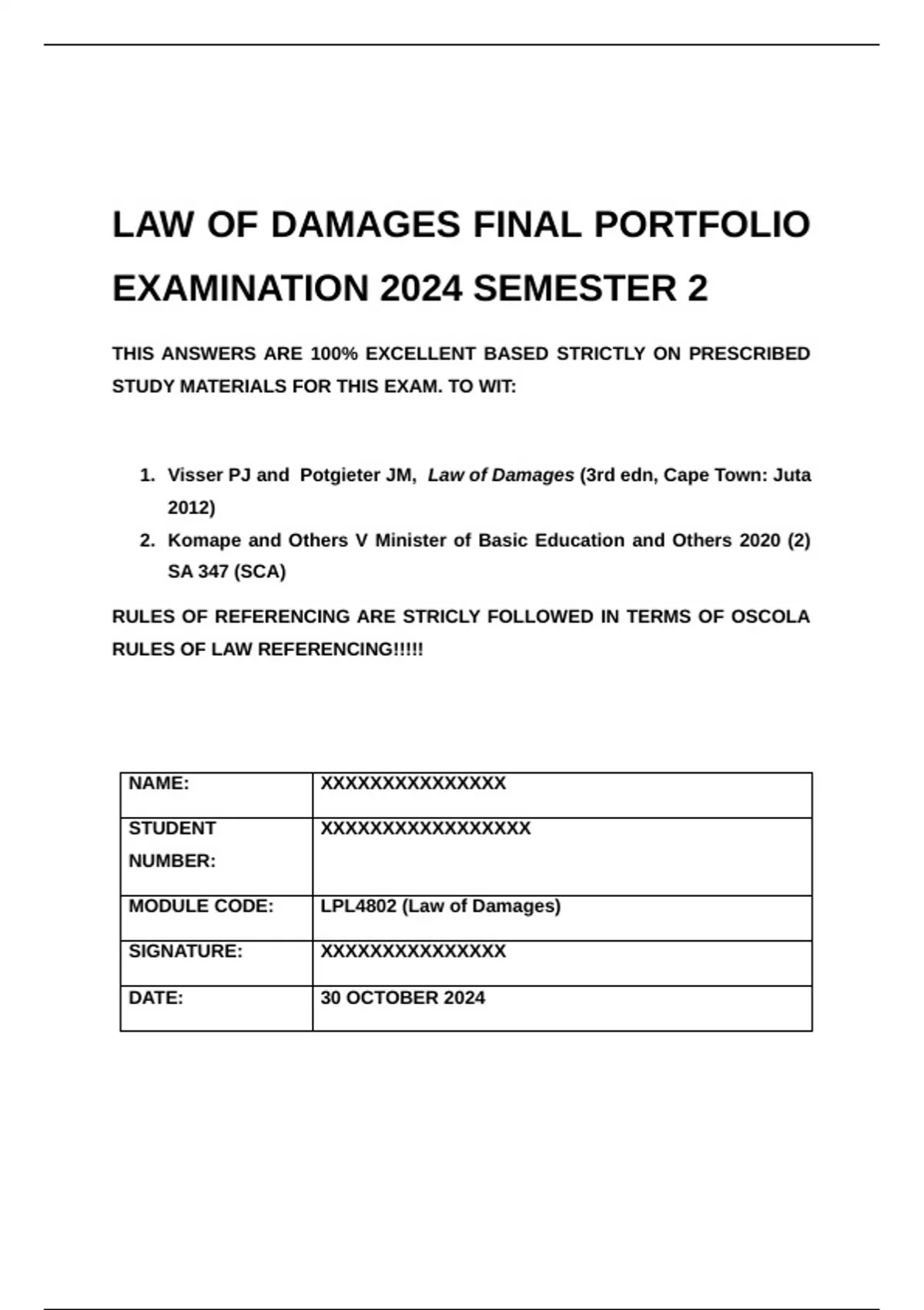 THIS DOCUMENT CONTAINS EXCELLENT REFRENCED ANSWERS FOR FOR LAW OF DAMAGAES EXAMINATION FOR OCTOBER DUE ON 30 OCTOBER 2024. ALL RULES AND THE TWO PRESCRIBED MATERIALS BEING THE TEXT BOOK AND GIVEN COURT CASE USED.